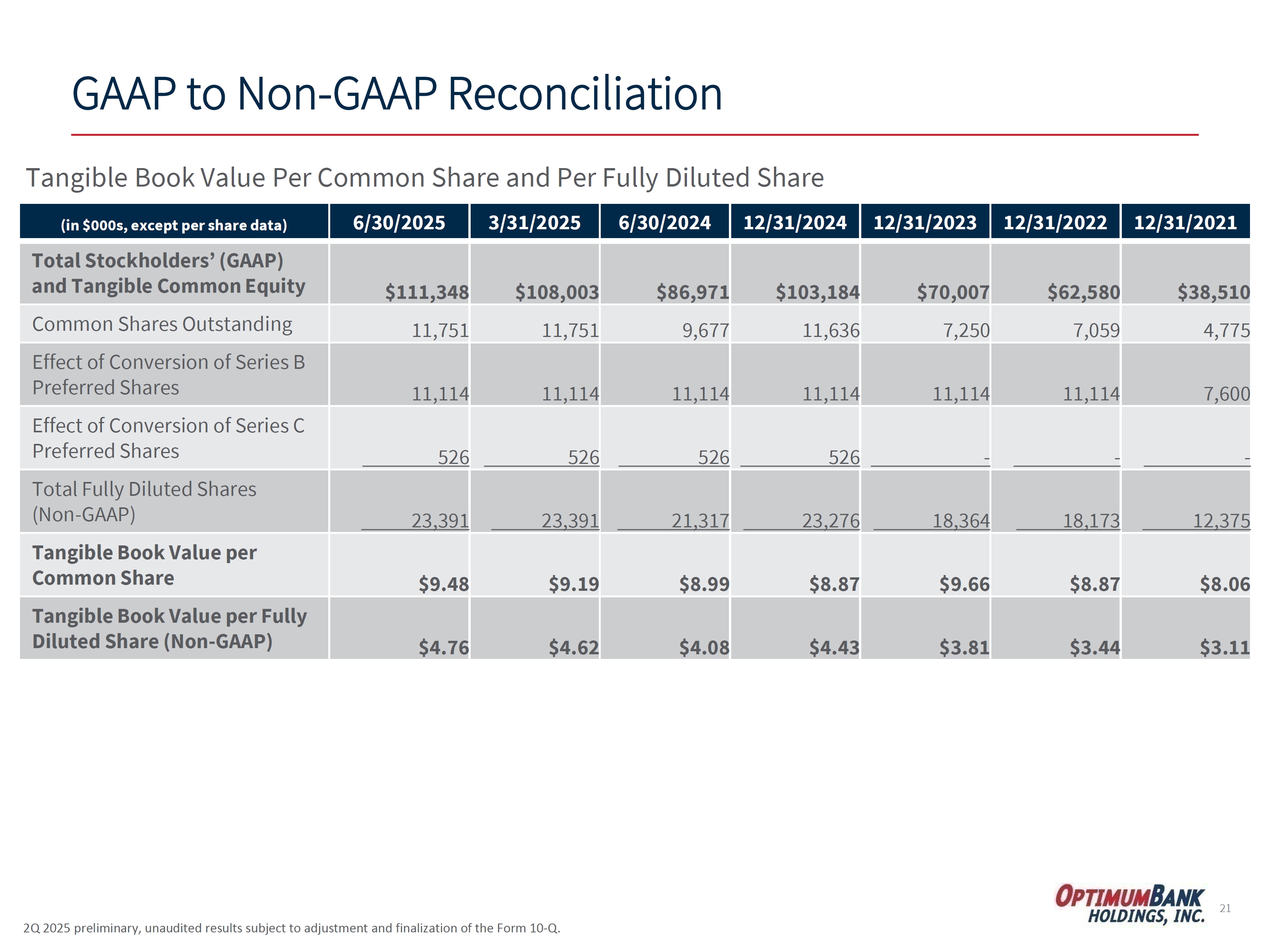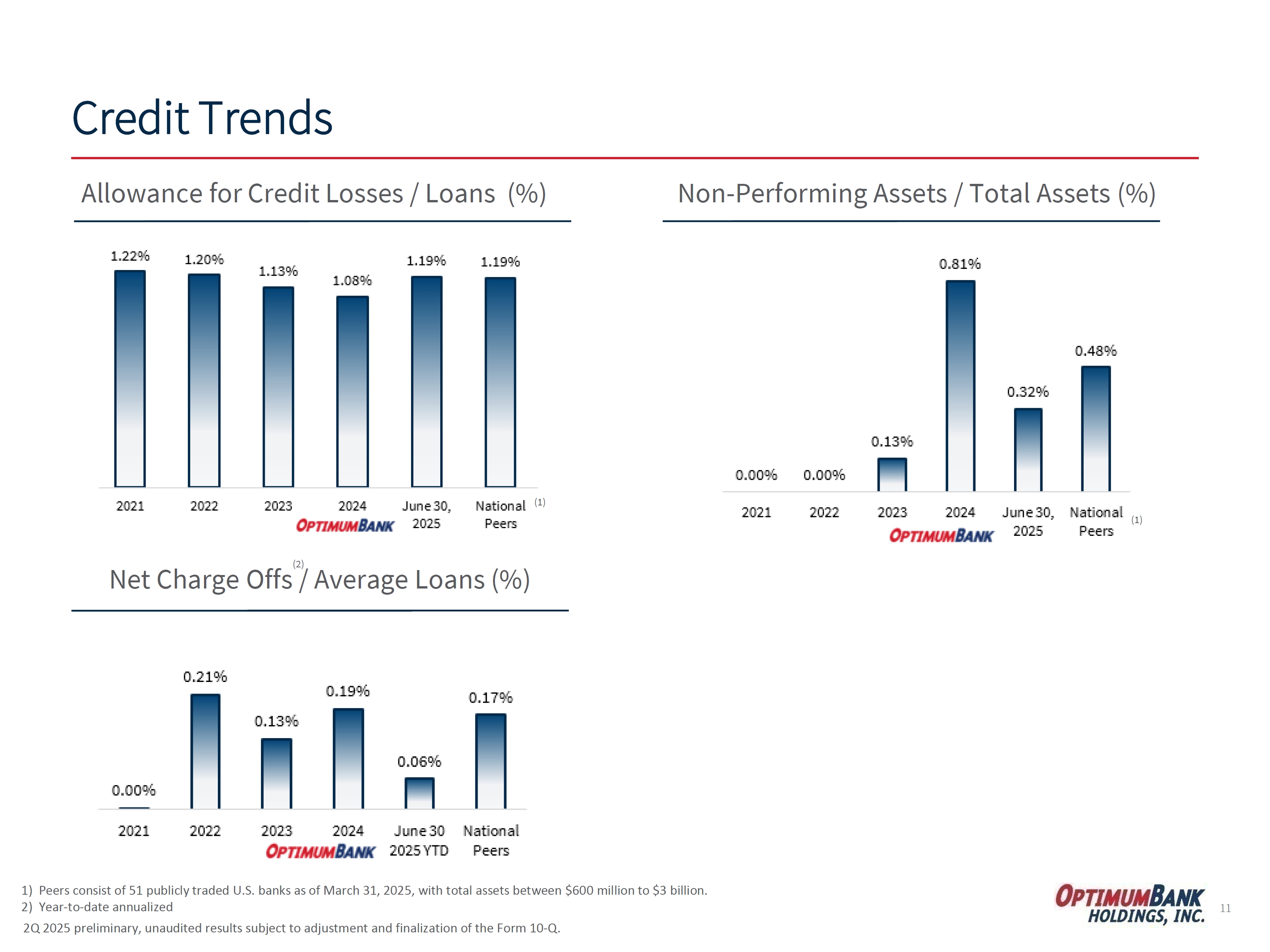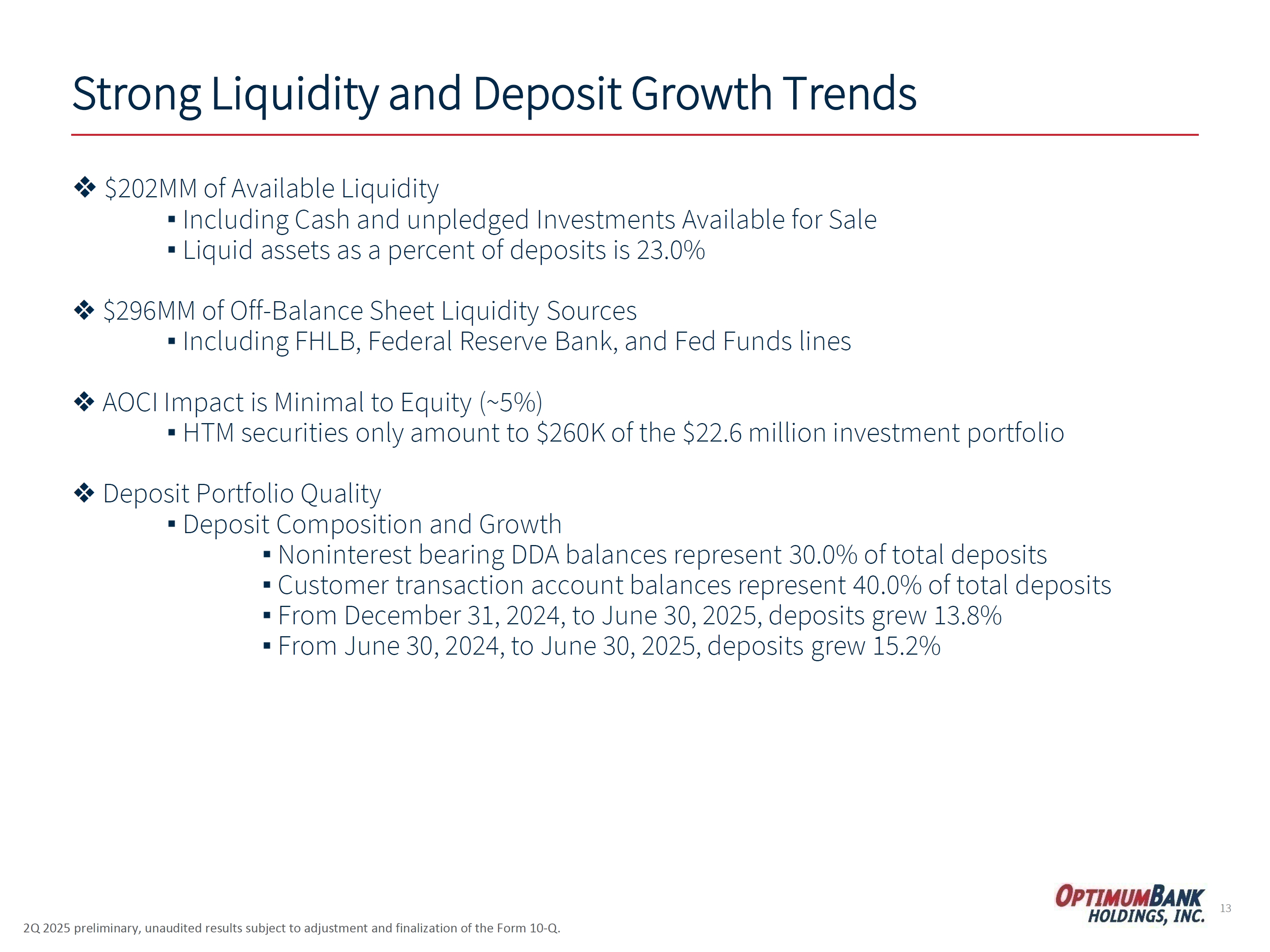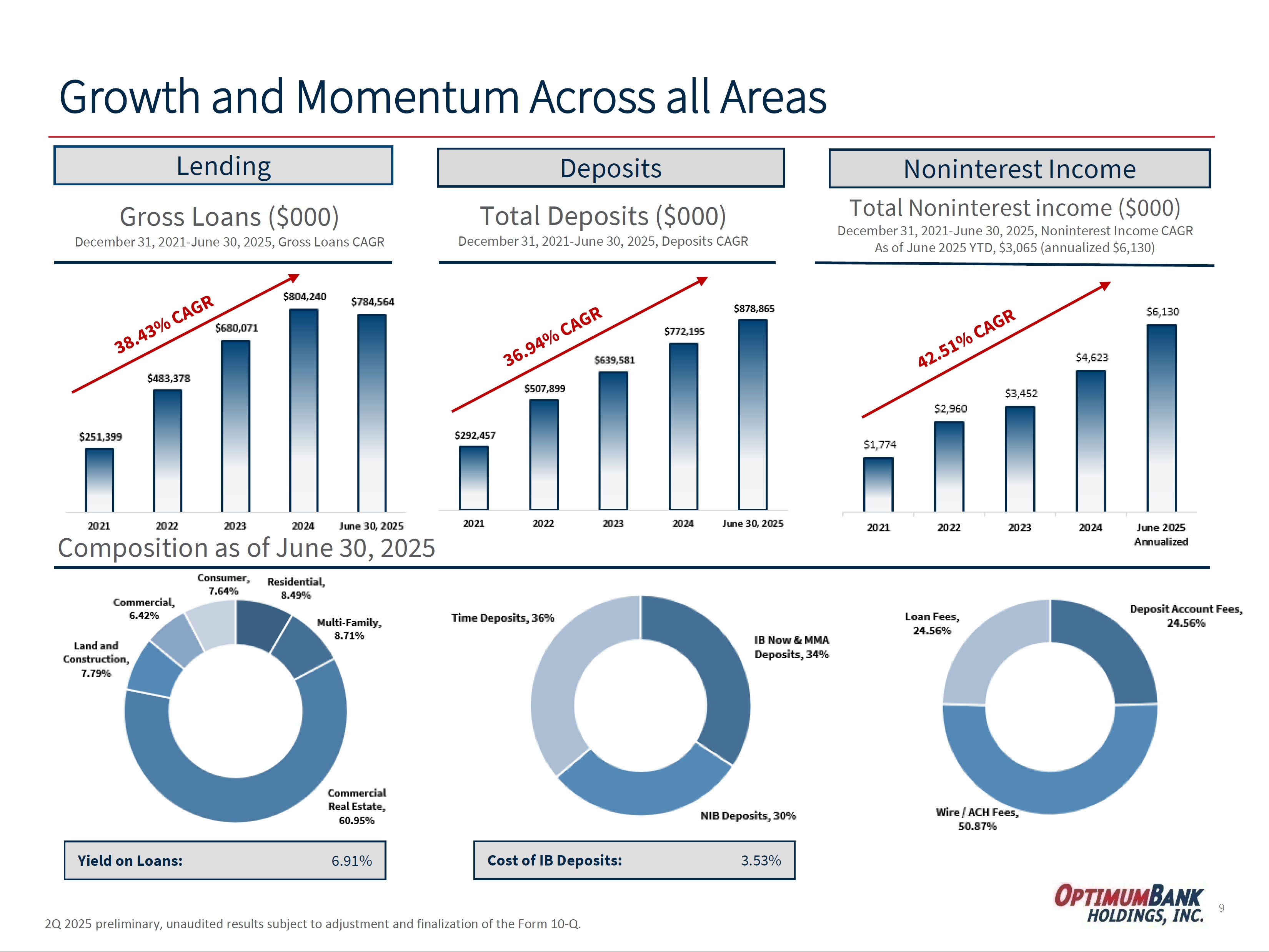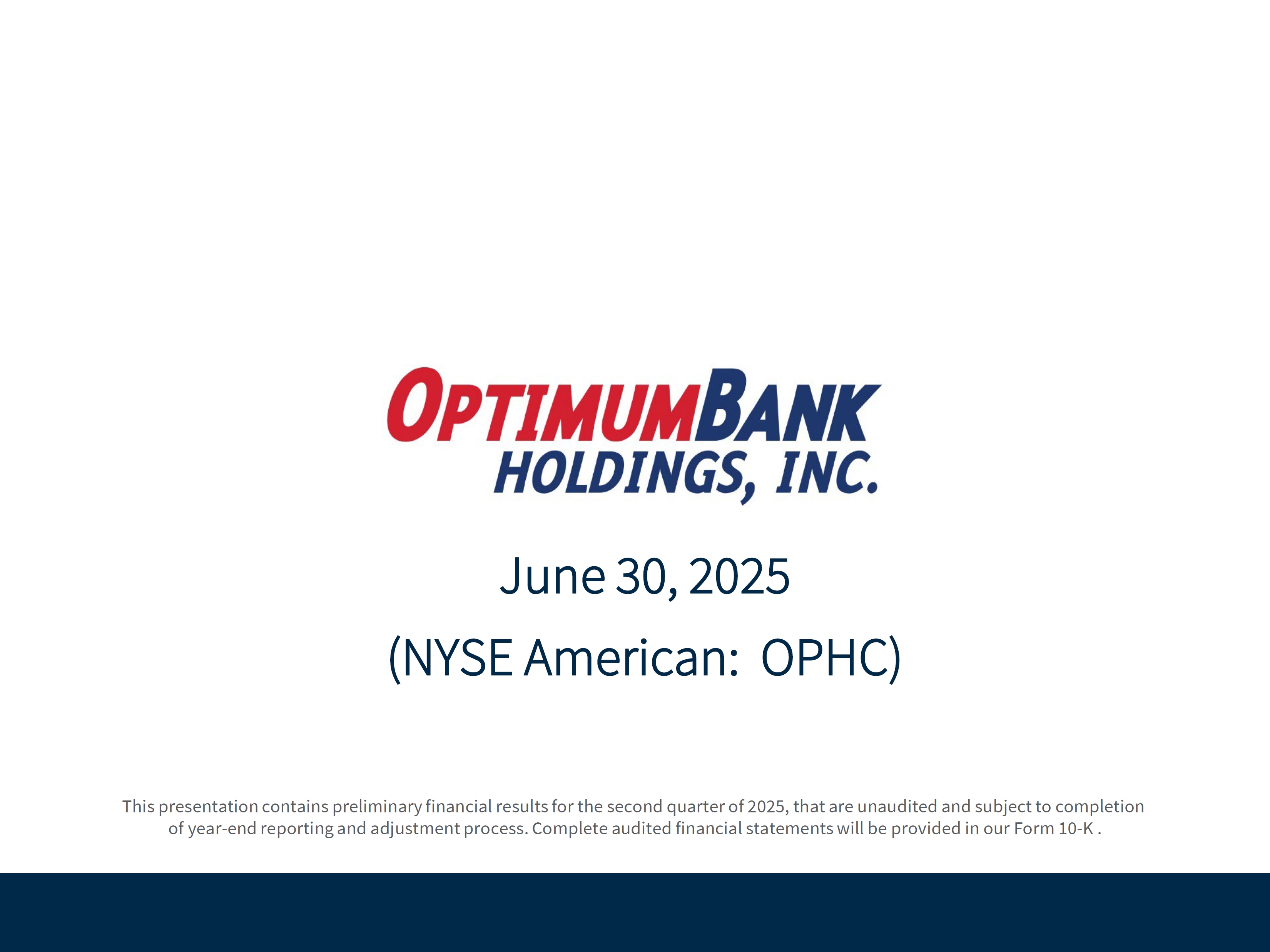 On July 24, 2025, OptimumBank Holdings, Inc. released a presentation describing its unaudited results of operations for the period ended June 30, 2025.