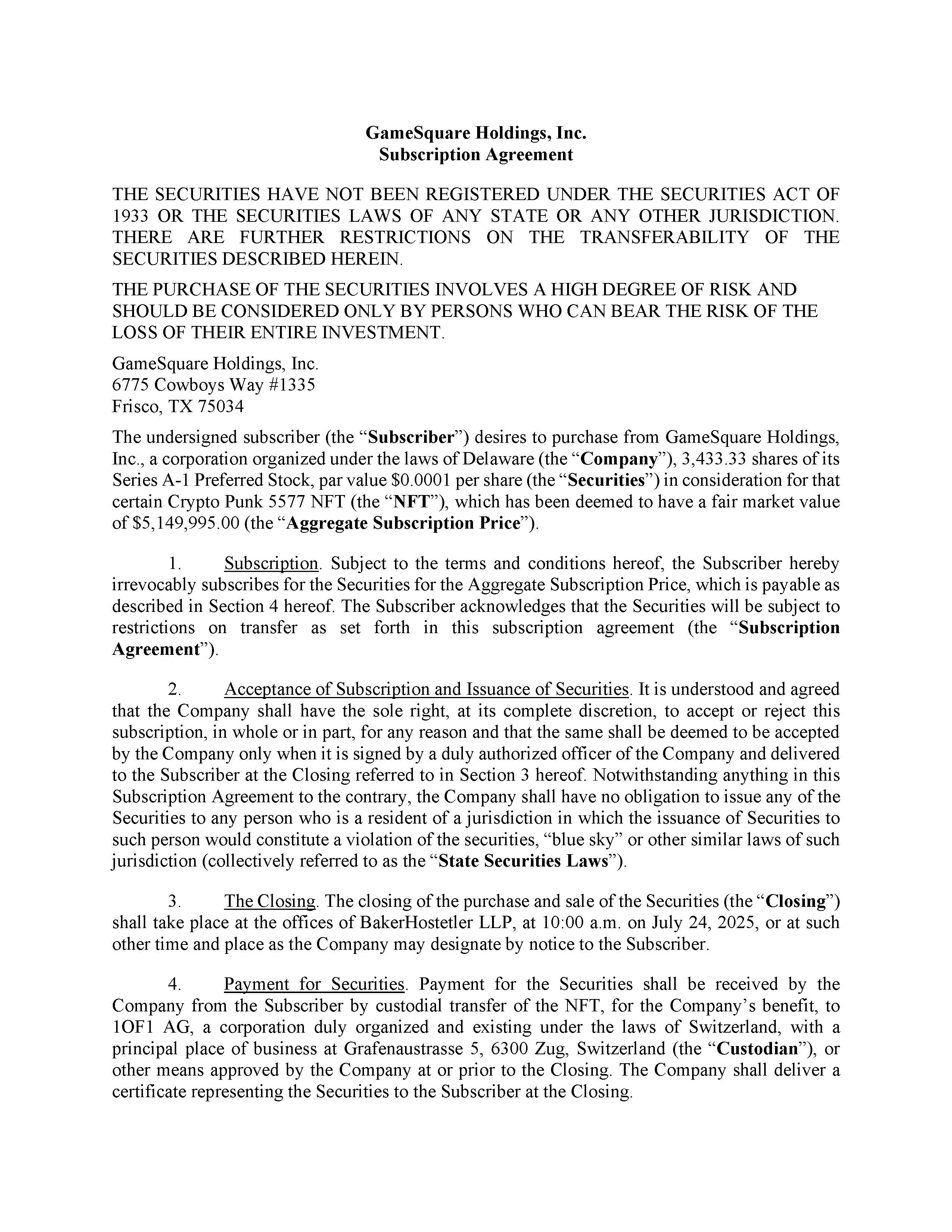 On July 24, 2025, GameSquare Holdings, Inc., a Delaware corporation (the “Company”) entered into a Subscription Agreement (the “Subscription Agreement”) with Robert Leshner (“Subscriber”), pursuant to which Subscriber purchased from the Company 3,433.33 shares of Series A-1 Convertible Preferred Stock of the Company, par value $0.0001 per share (the “Series A-1 Preferred Stock”), in consideration for that certain Crypto Punk 5577 non-fungible token, which has been deemed to have a fair market value of $5,149,995.00 (the “Issuance”).