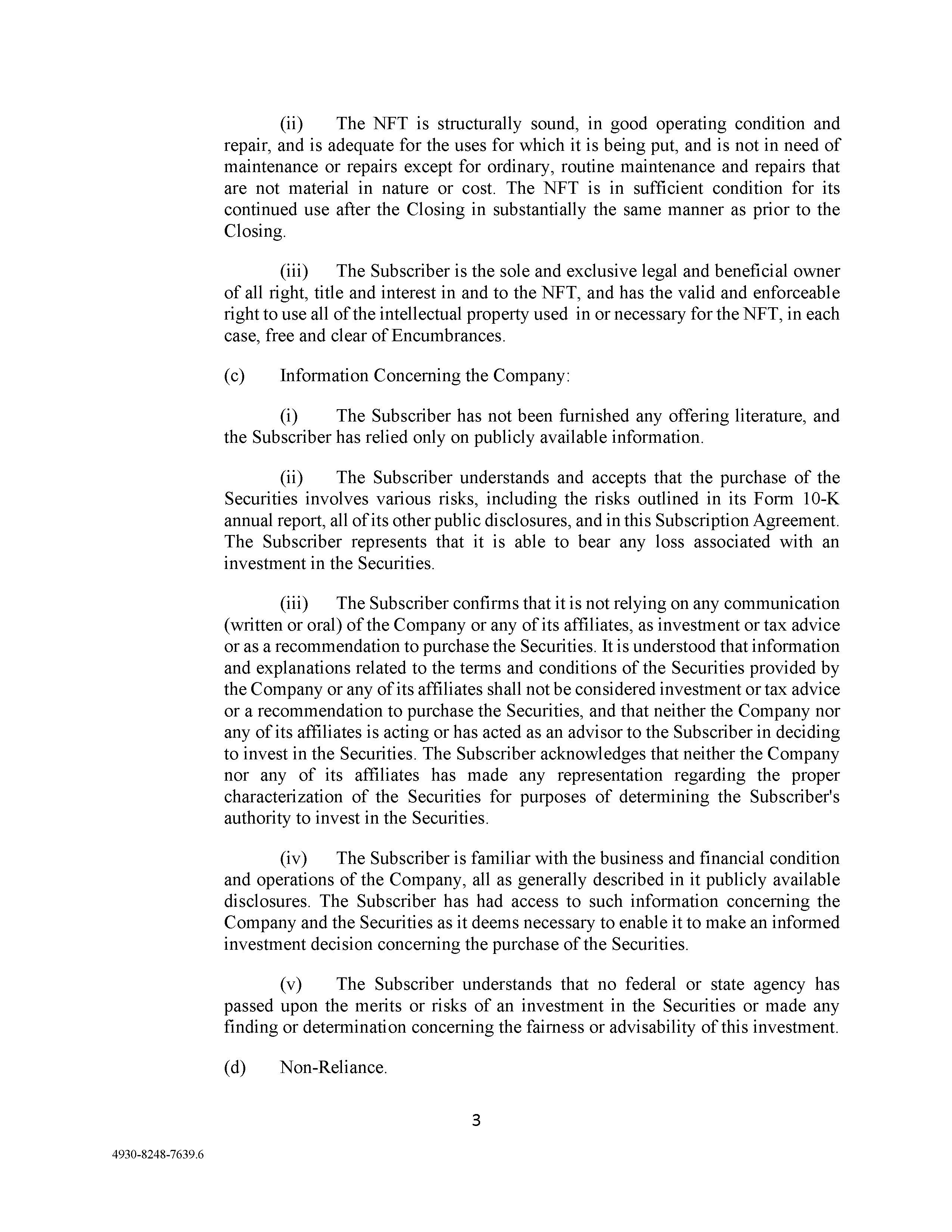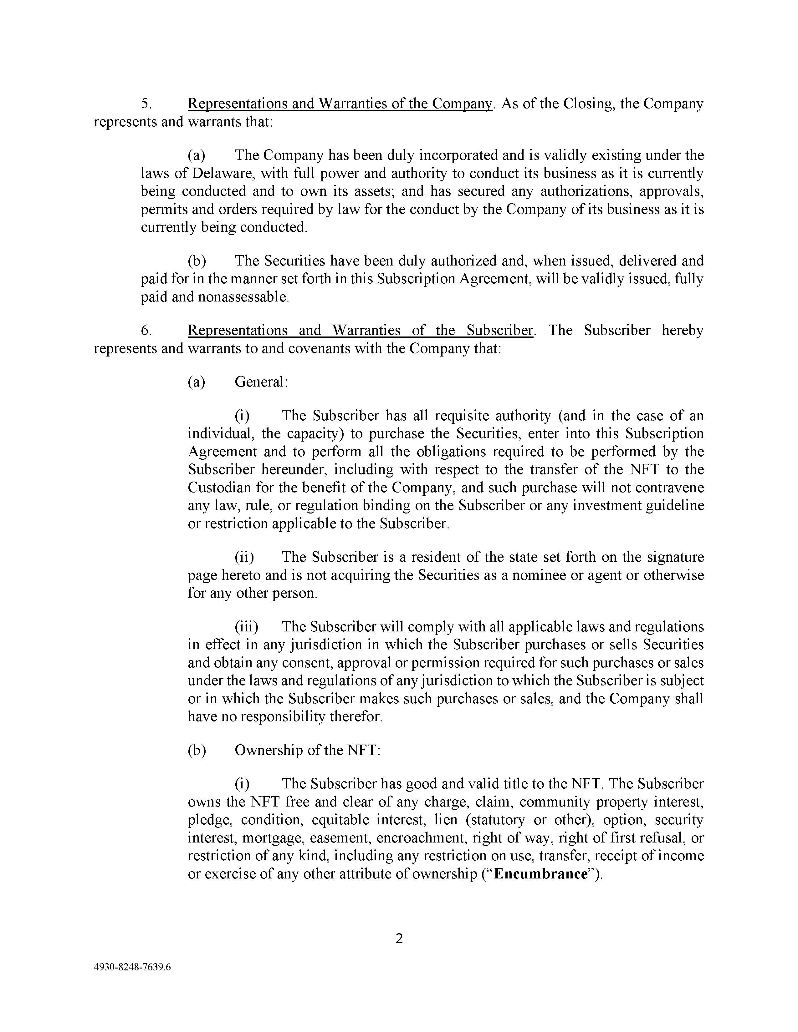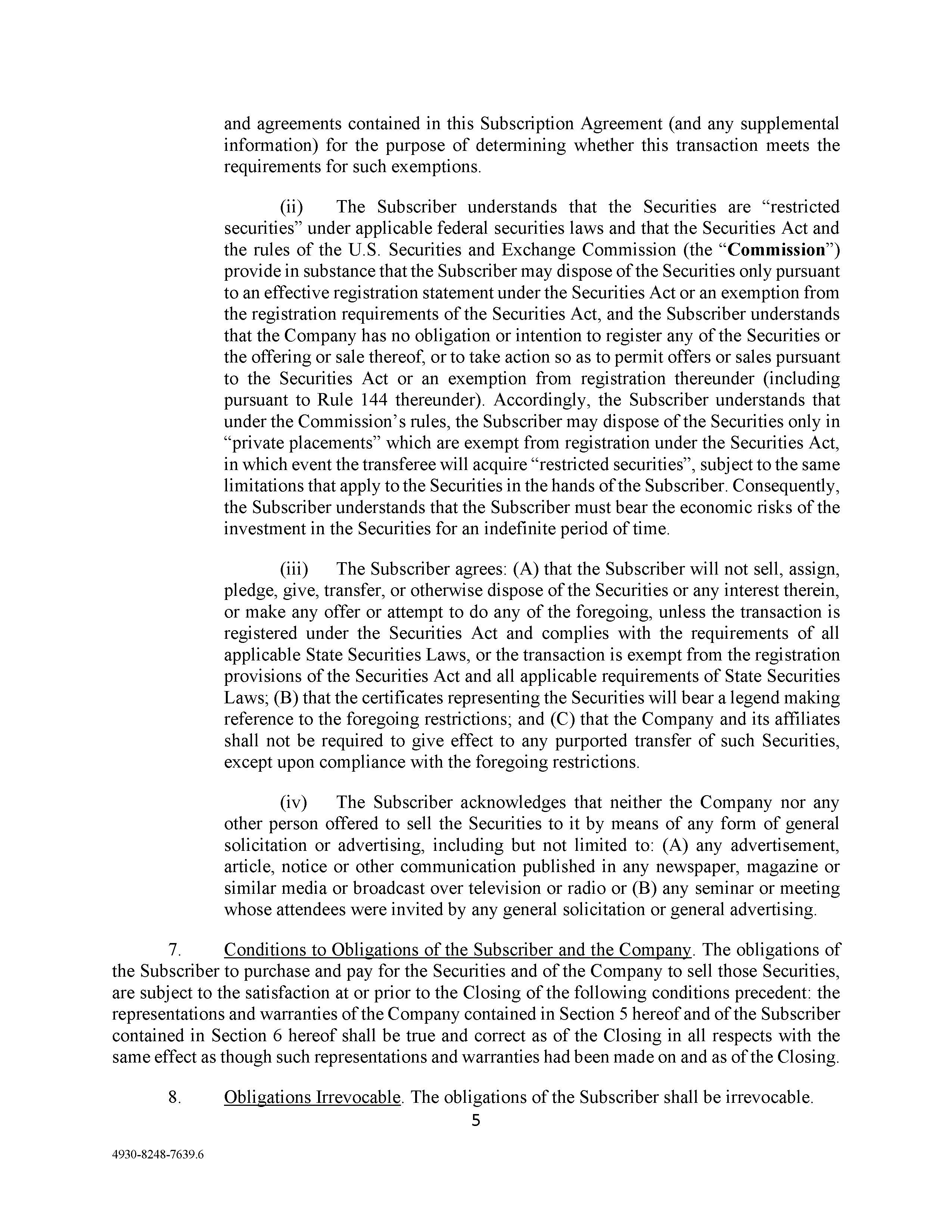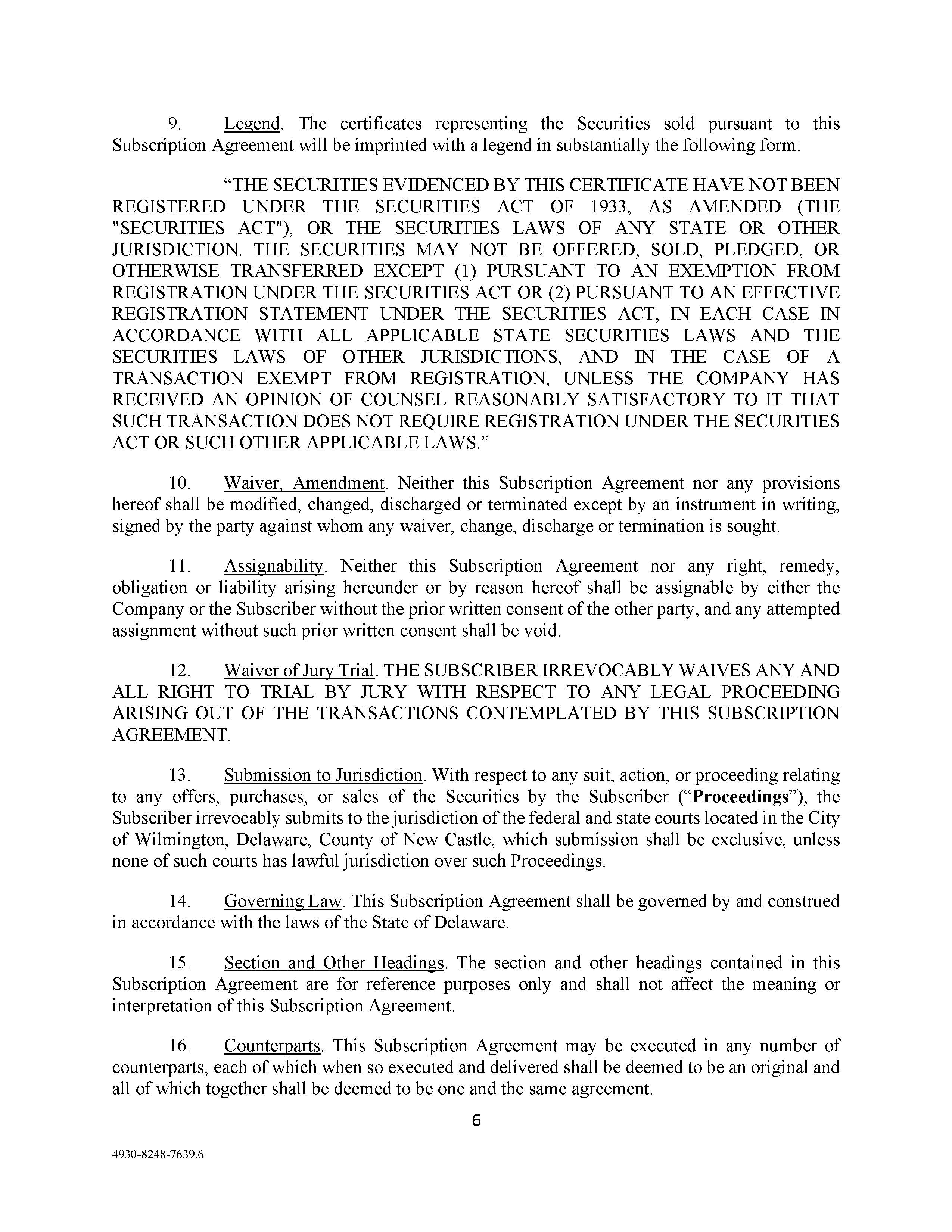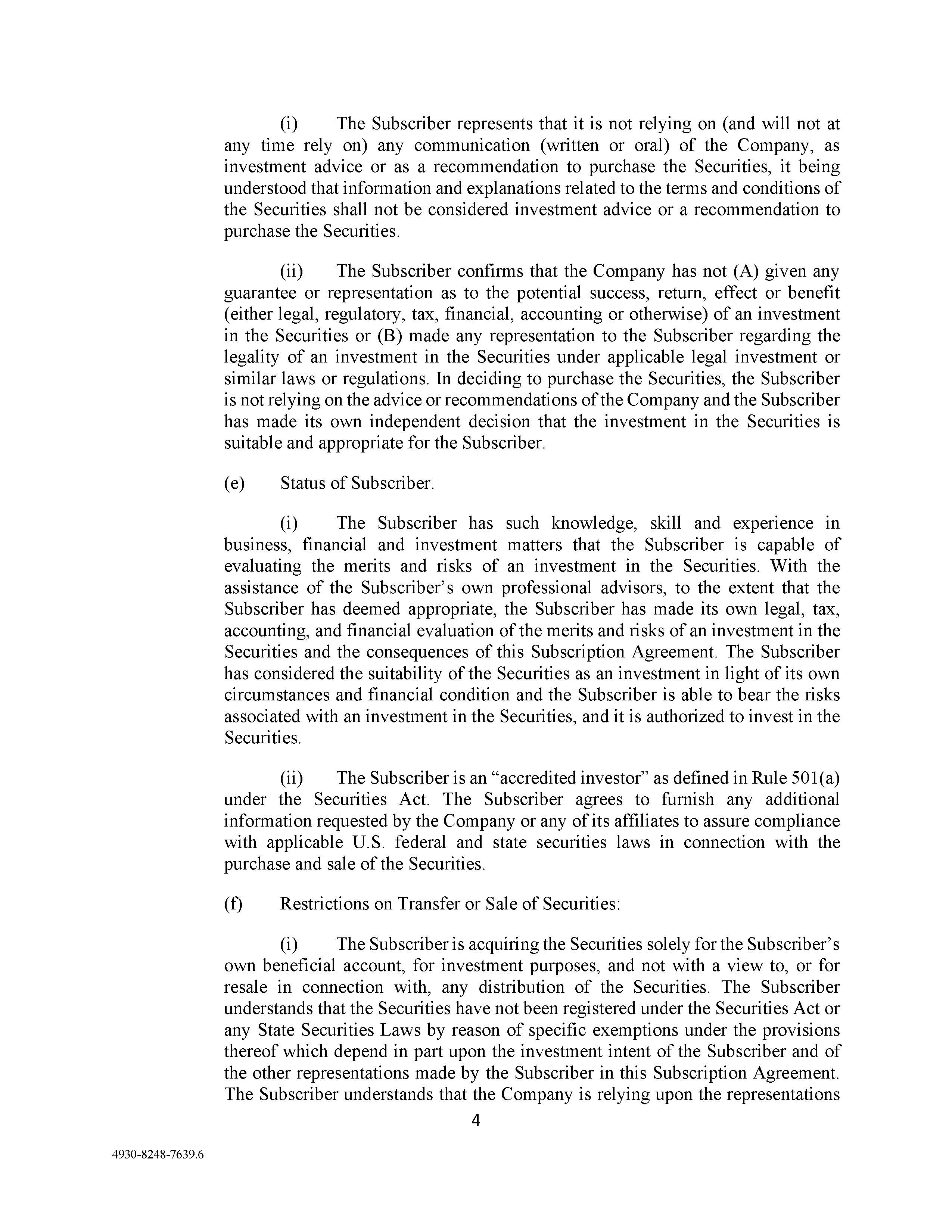The Subscription Agreement contains customary representations, warranties and covenants by the Company and the Subscriber.