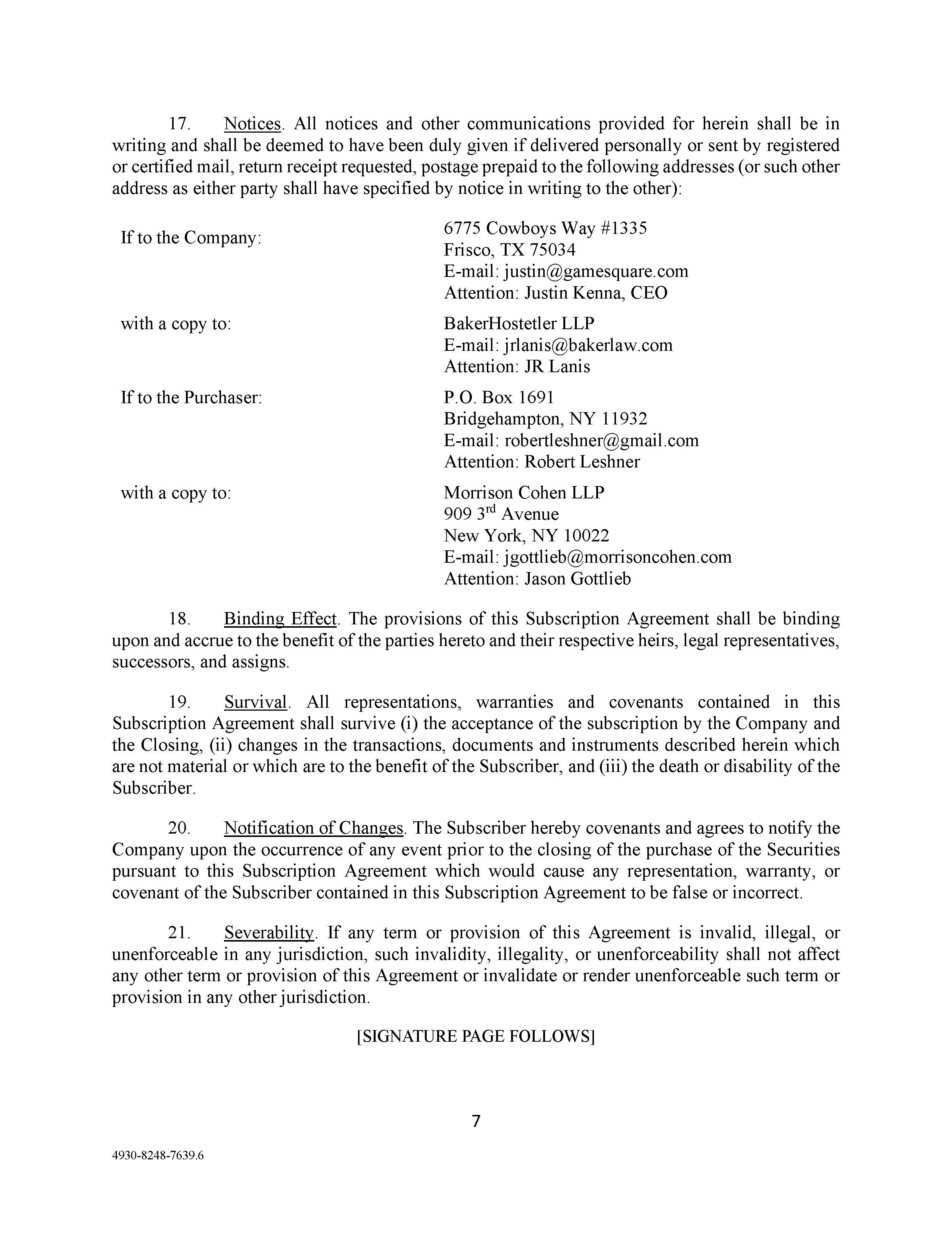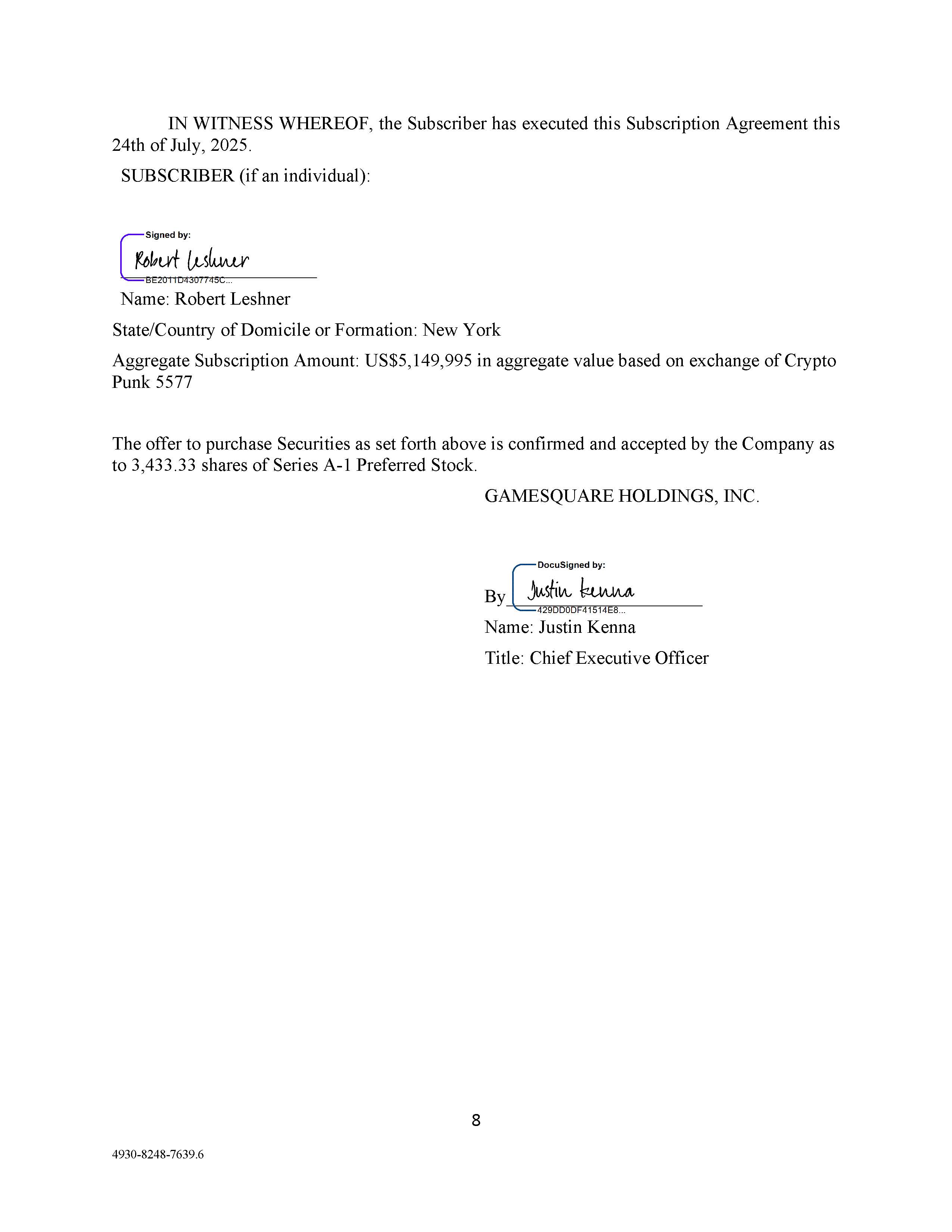 | 10.1 | Subscription Agreement between GameSquare Holdings, Inc. and Robert Leshner dated as of July 24, 2025. | |