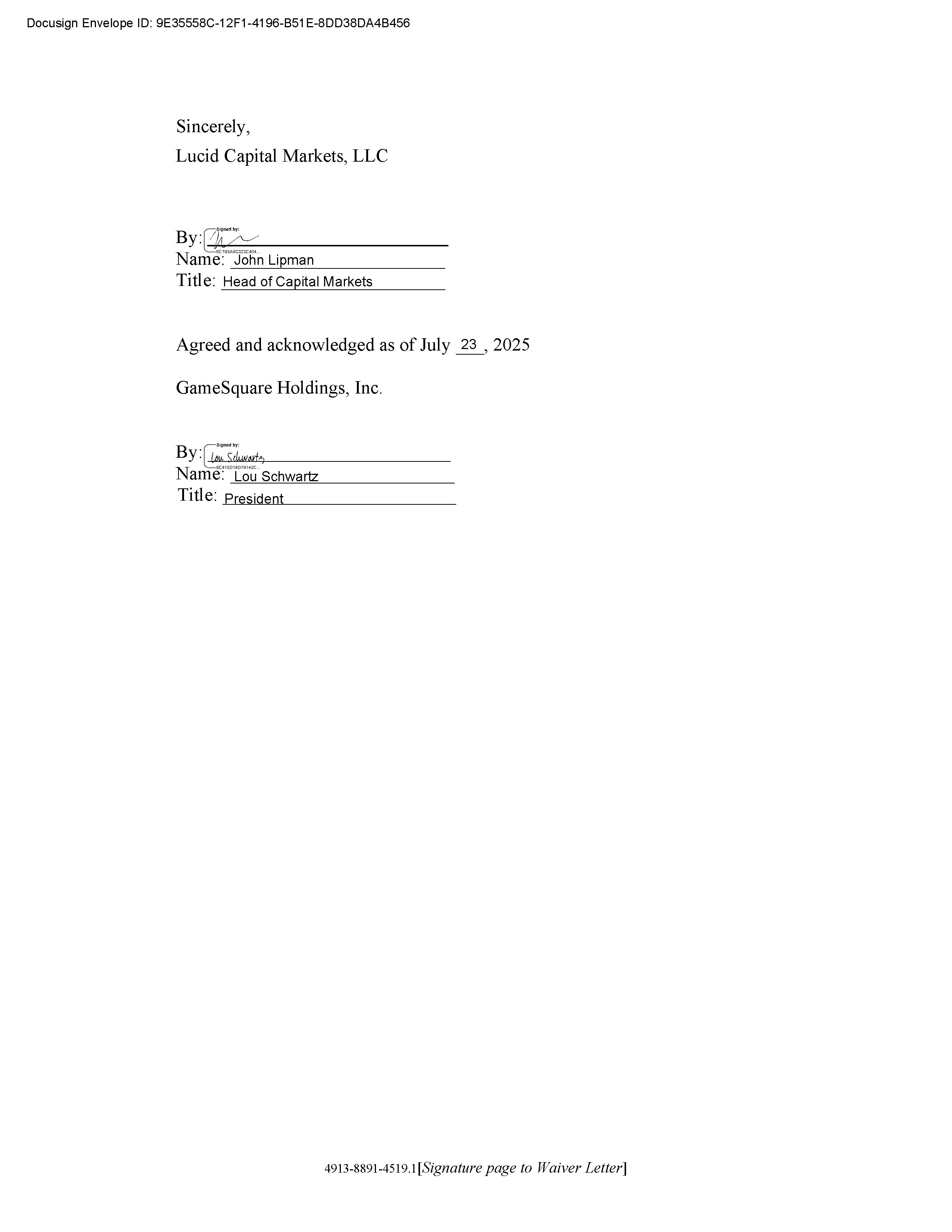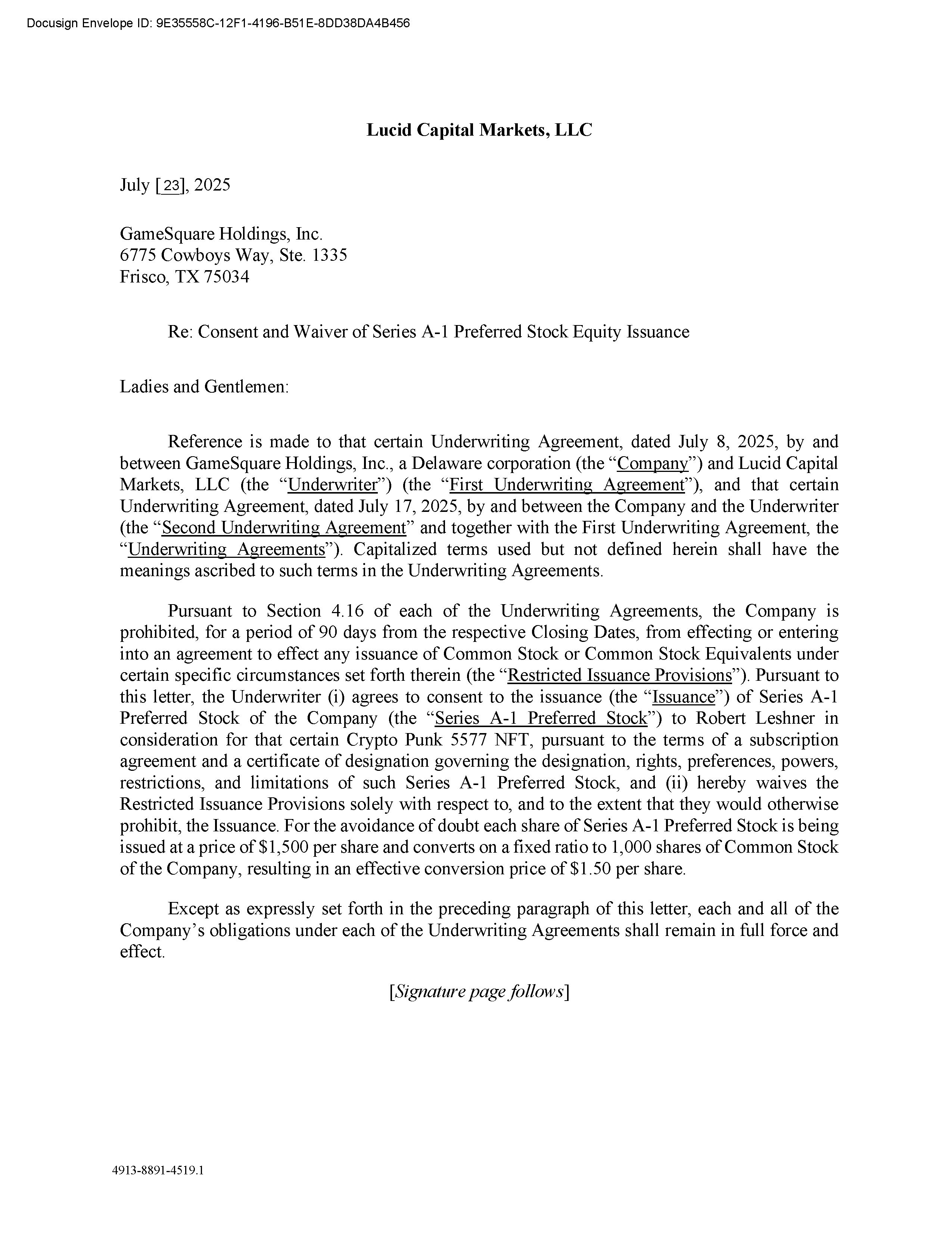 | 10.2 | Consent and Waiver of Series A-1 Preferred Stock Equity Issuance by Lucid Capital Markets, LLC, dated as of July 23, 2025. | |