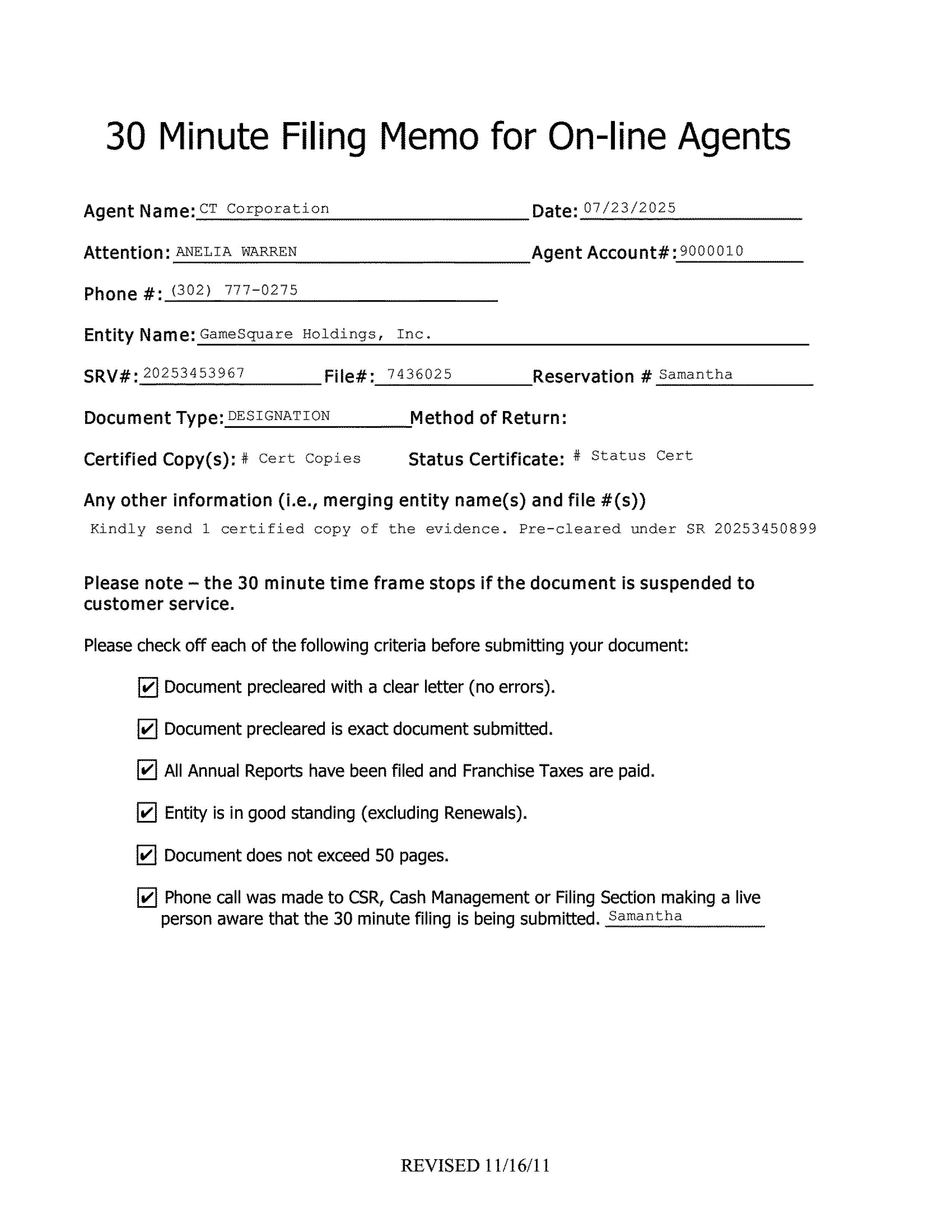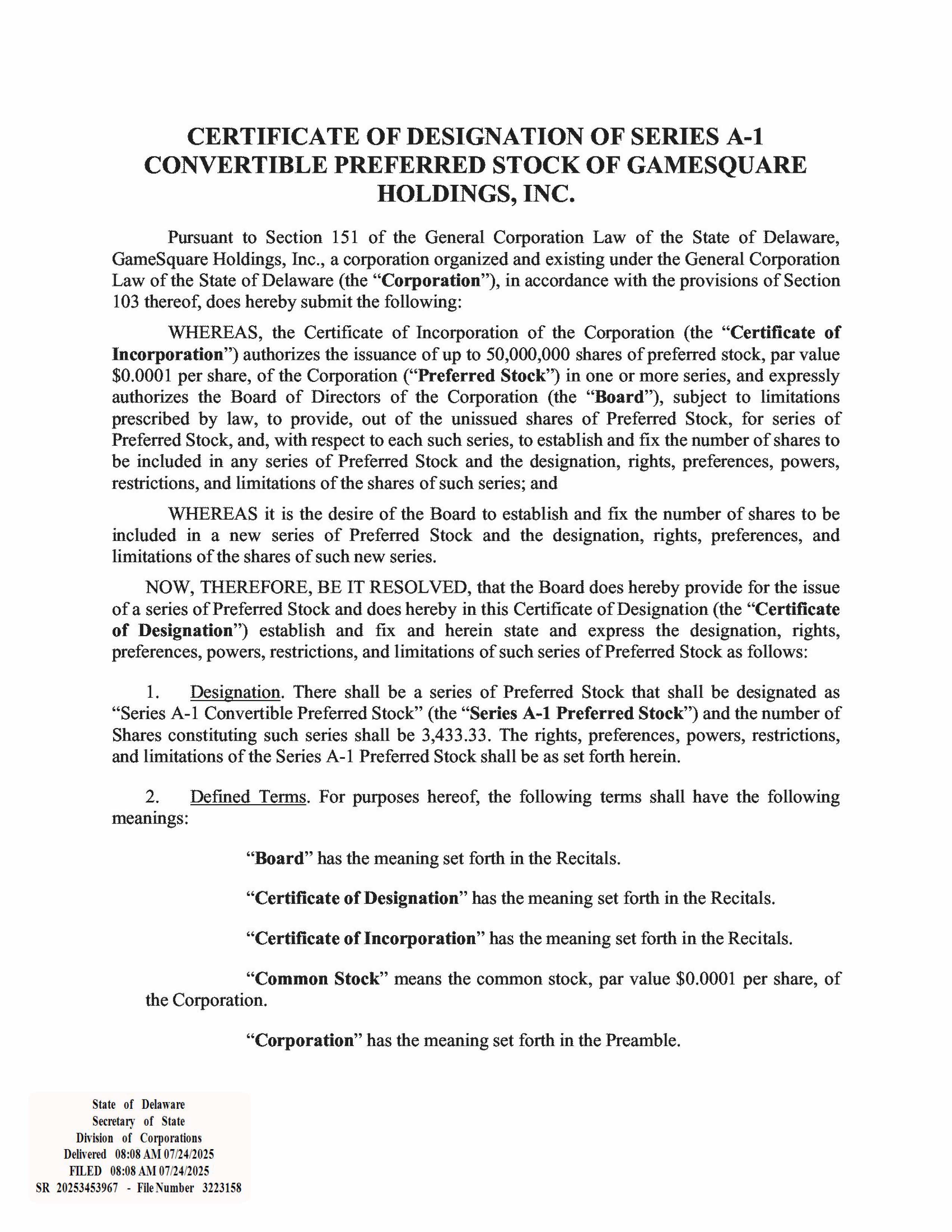 | 3.1 | Certificate of Designation of Series A-1 Convertible Preferred Stock of GameSquare Holdings, Inc., dated as of July 24, 2025. | |