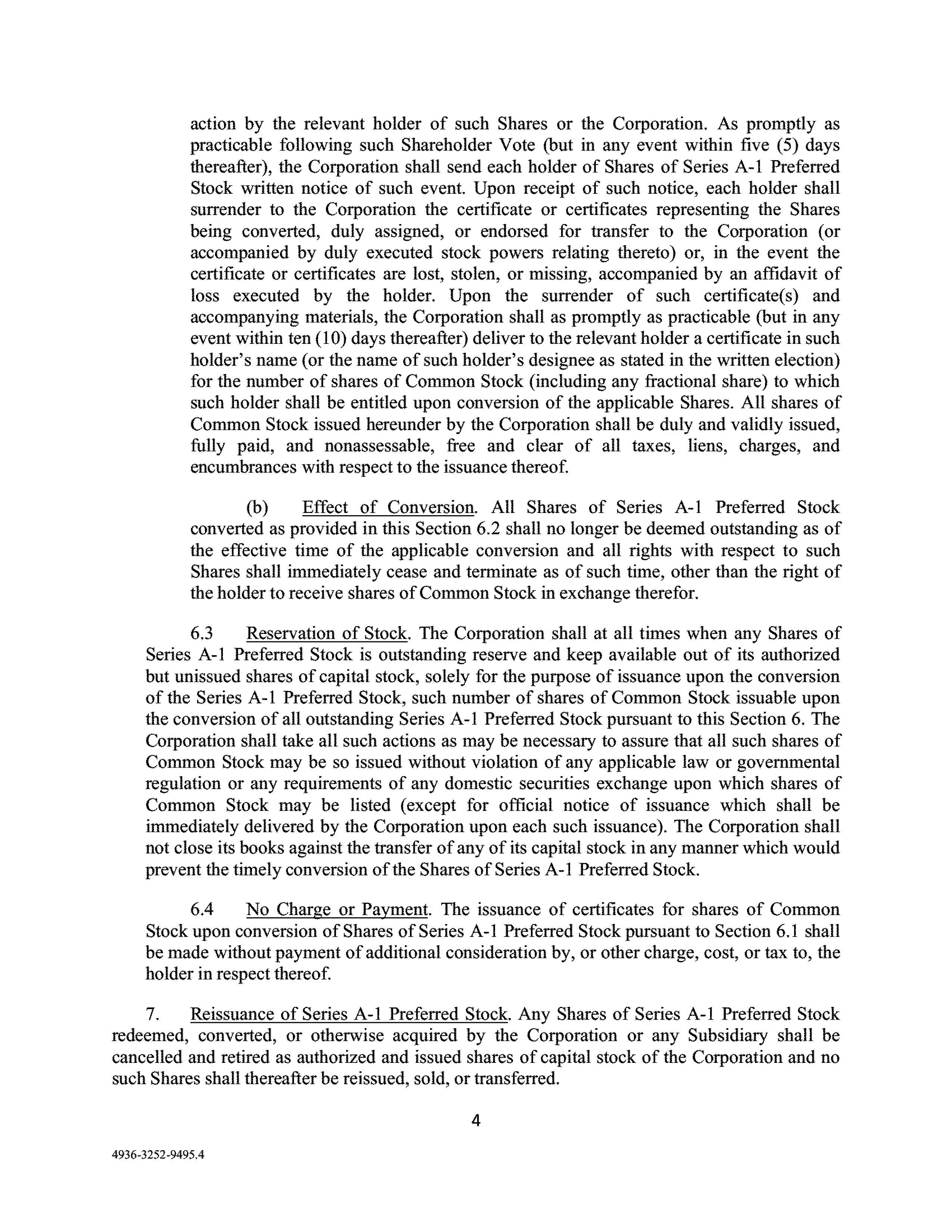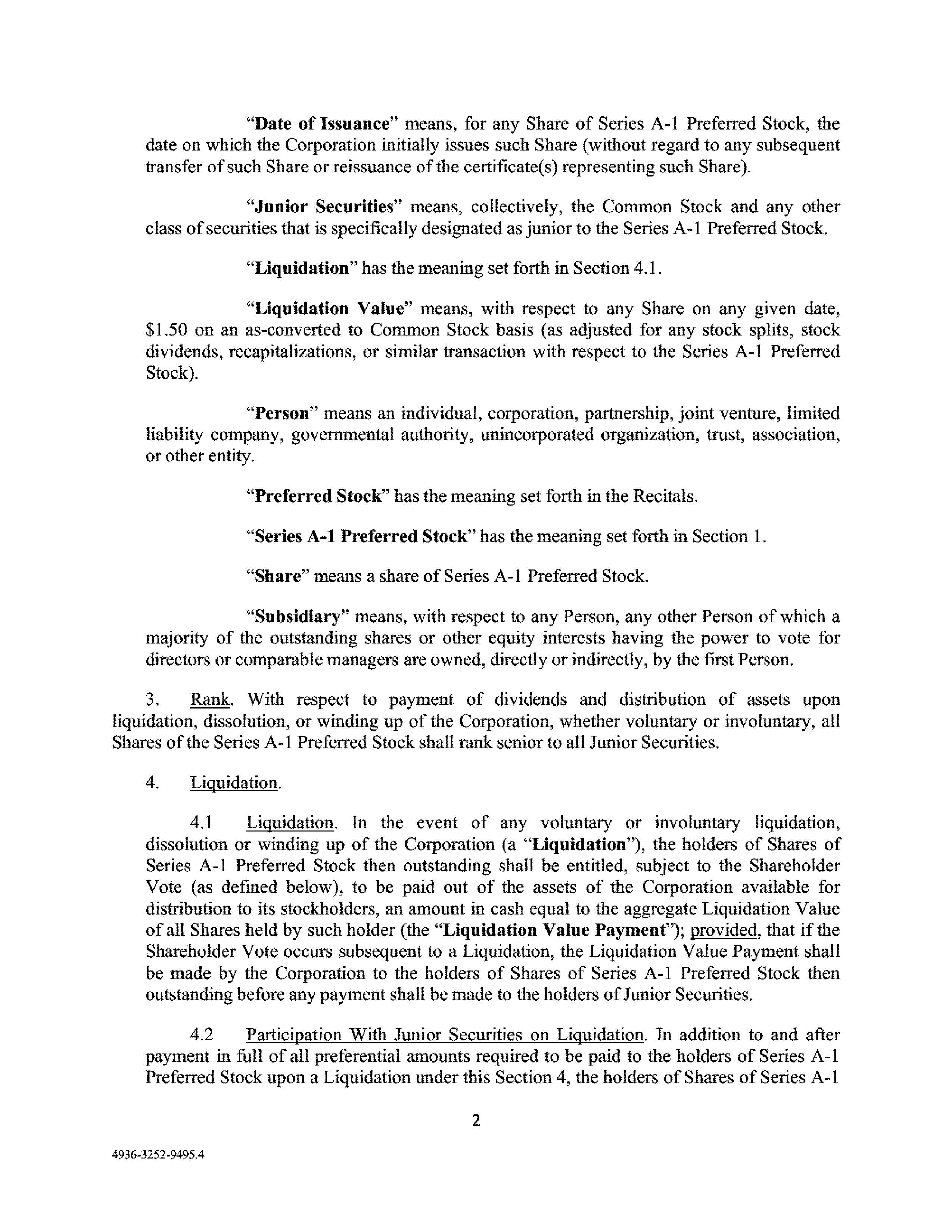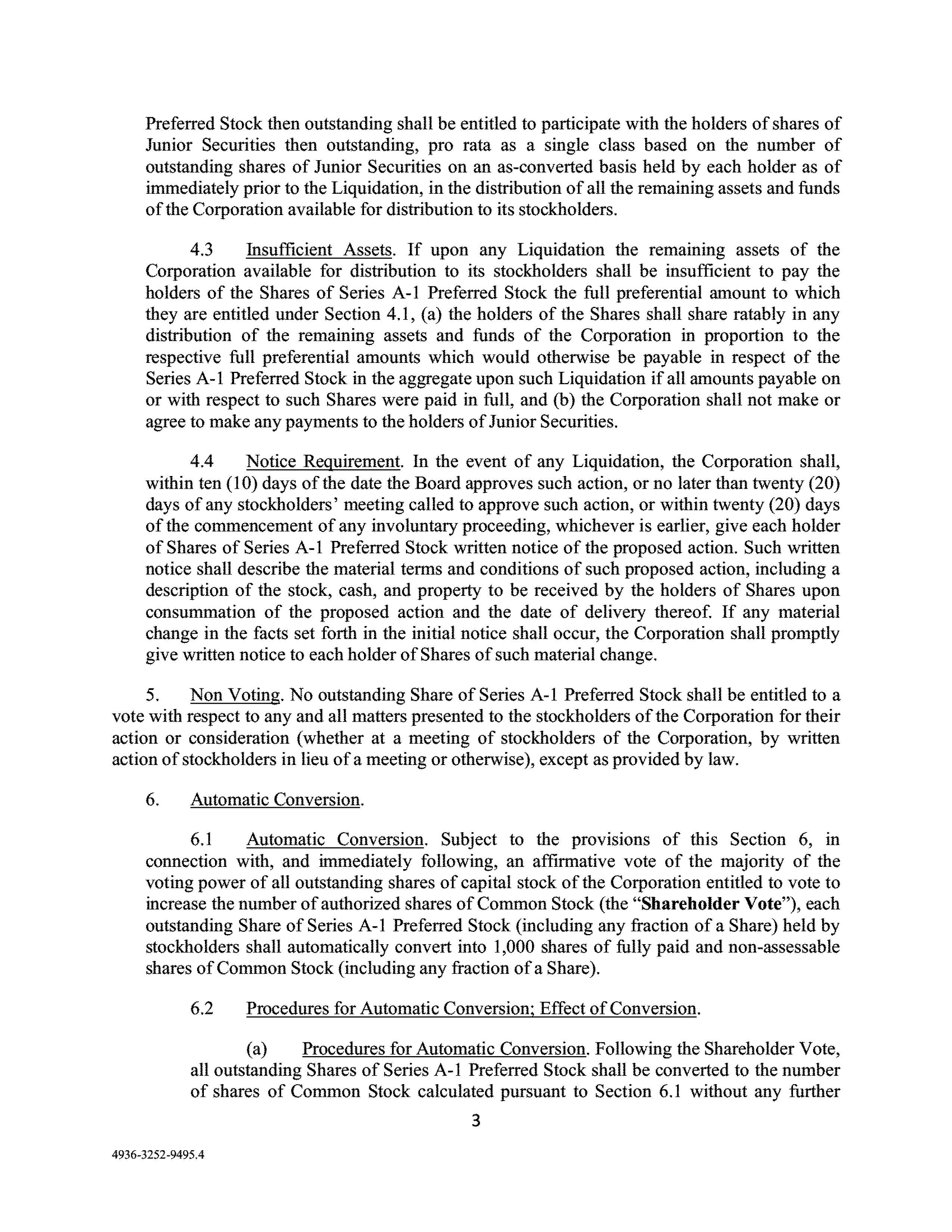The Series A-1 Preferred Stock ranks senior to all junior securities, including Common Stock, and carries a $1.50 per share liquidation preference on an as-converted basis, with such preference subject to the Shareholder Vote Condition. After satisfying this preference, holders participate pro rata with junior securities. The Series A-1 Preferred Stock has no voting rights, and upon satisfaction of the Shareholder Vote Condition, each share of Series A-1 Preferred Stock will automatically convert into 1,000 shares of the Common Stock.