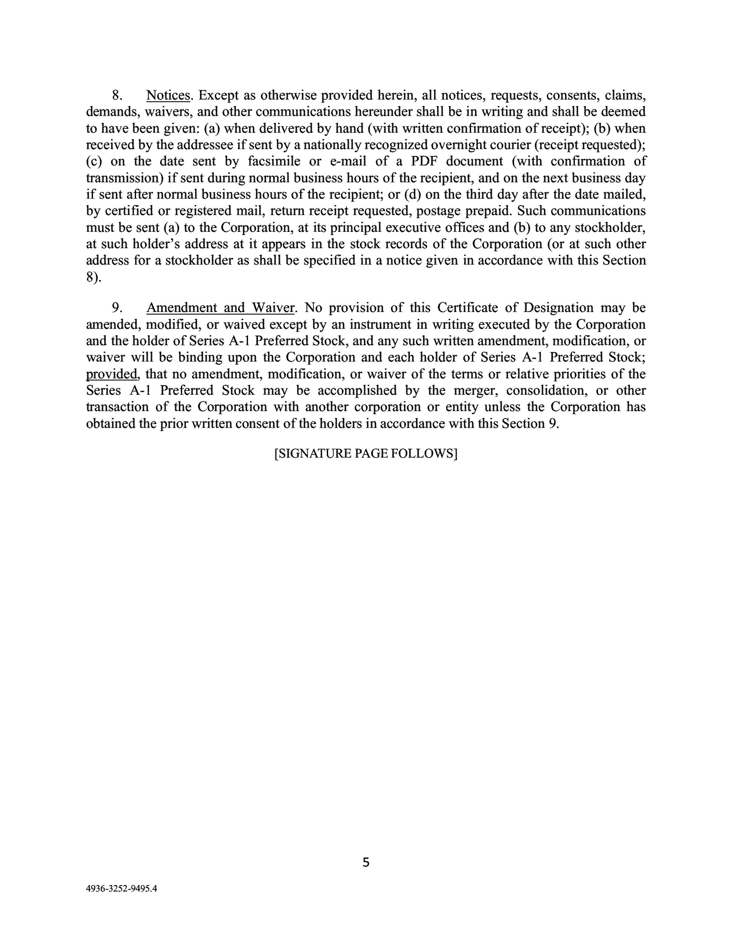 A copy of the Certificate of Designation is filed as Exhibit 3.1 to this Current Report on Form 8-K and is incorporated herein by reference.
