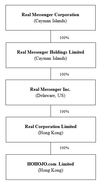 We are a holding company primarily operating in Hong Kong through our holding subsidiaries, Real Messenger Holdings Limited (“RMHL”) and Real Messenger Inc. Unless otherwise stated or unless the context otherwise requires, the terms “Company,” “the registrant,” “our company,” “the company,” “we,” “us,” “our,” “ours” and “RMSG” refer to Real Messenger Corporation, a Cayman Islands exempted company, and its subsidiaries.