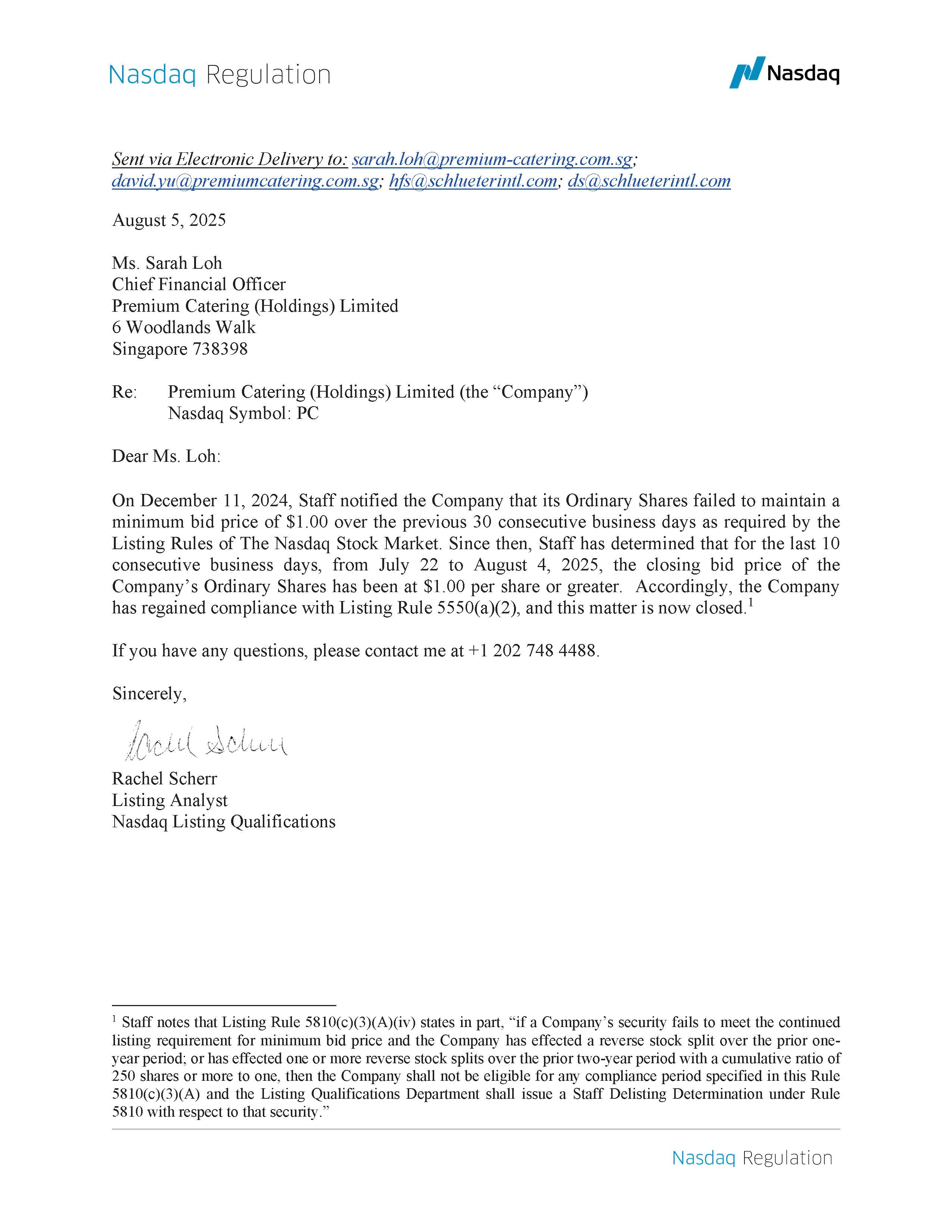 Premium Catering (Holdings) Limited, a Cayman Islands exempt company (the “Corporation”), received a letter dated August 5, 2025 (the “Compliance Letter”) from the Listing Qualifications Department of The Nasdaq Stock Market LLC (“Nasdaq”). The Compliance Letter informed the Company that it had regained compliance with Nasdaq’s bid price requirement (the “Bid Price Requirement”) in Listing Rule 5550(a)(2) and that the Company is therefore in compliance with the Nasddaq Capital Market’s listing requirements. Accordingly, the Company’s ordinary shares will continue to be listed on The Nasdaq Capital Market, and Nasdaq considers the matter closed.