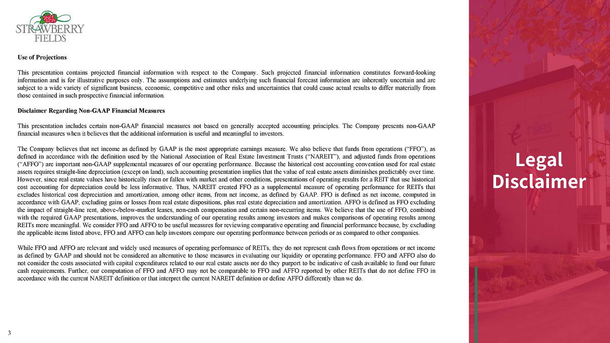 The Company believes that funds from operations (“FFO”), as defined in accordance with the definition used by the National Association of Real Estate Investment Trusts (“NAREIT”), and adjusted funds from operations (“AFFO”) are important non-GAAP supplemental measures of our operating performance. Because the historical cost accounting convention used for real estate assets requires straight-line depreciation (except on land), such accounting presentation implies that the value of real estate assets diminishes predictably over time. However, since real estate values have historically risen or fallen with market and other conditions, presentations of operating results for a REIT that uses historical cost accounting for depreciation could be less informative. Thus, NAREIT created FFO as a supplemental measure of operating performance for REITs that excludes historical cost depreciation and amortization, among other items, from net income, as defined by GAAP. FFO is defined as net income, computed in accordance with GAAP, excluding gains or losses from real estate dispositions, plus real estate depreciation and amortization. AFFO is defined as FFO excluding the impact of straight-line rent, above-/below-market leases, non-cash compensation and certain non-recurring items. We believe that the use of FFO, combined with the required GAAP presentations, improves the understanding of our operating results among investors and makes comparisons of operating results among REITs more meaningful. We consider FFO and AFFO to be useful measures for reviewing comparative operating and financial performance because, by excluding the applicable items listed above, FFO and AFFO can help investors compare our operating performance between periods or as compared to other companies.