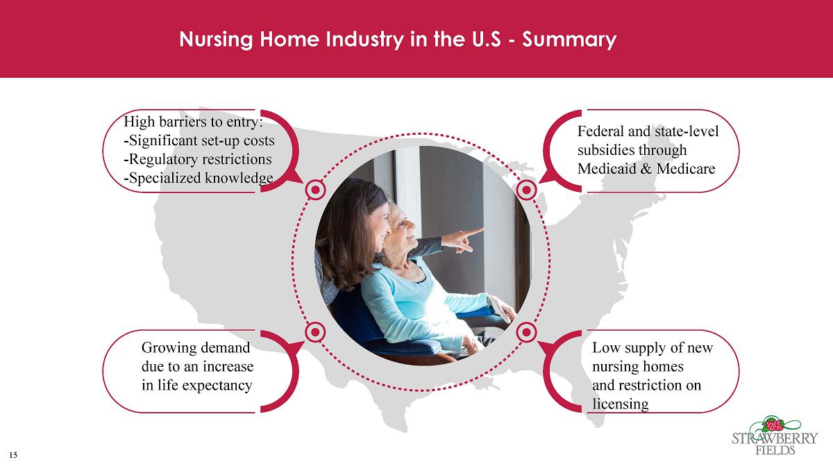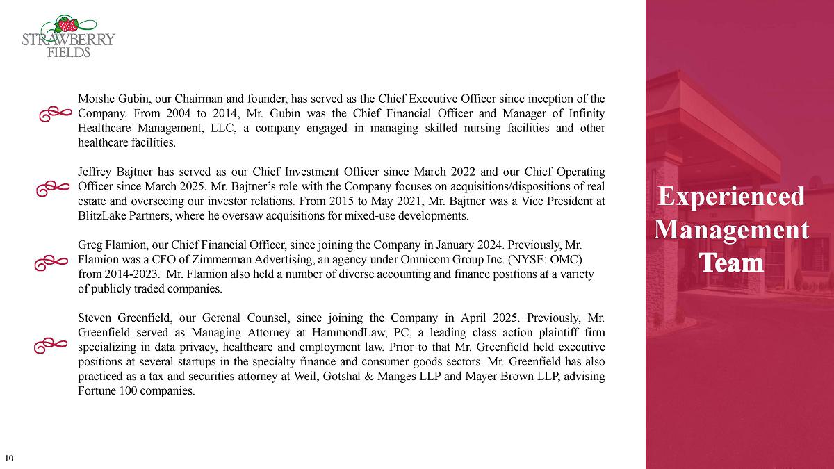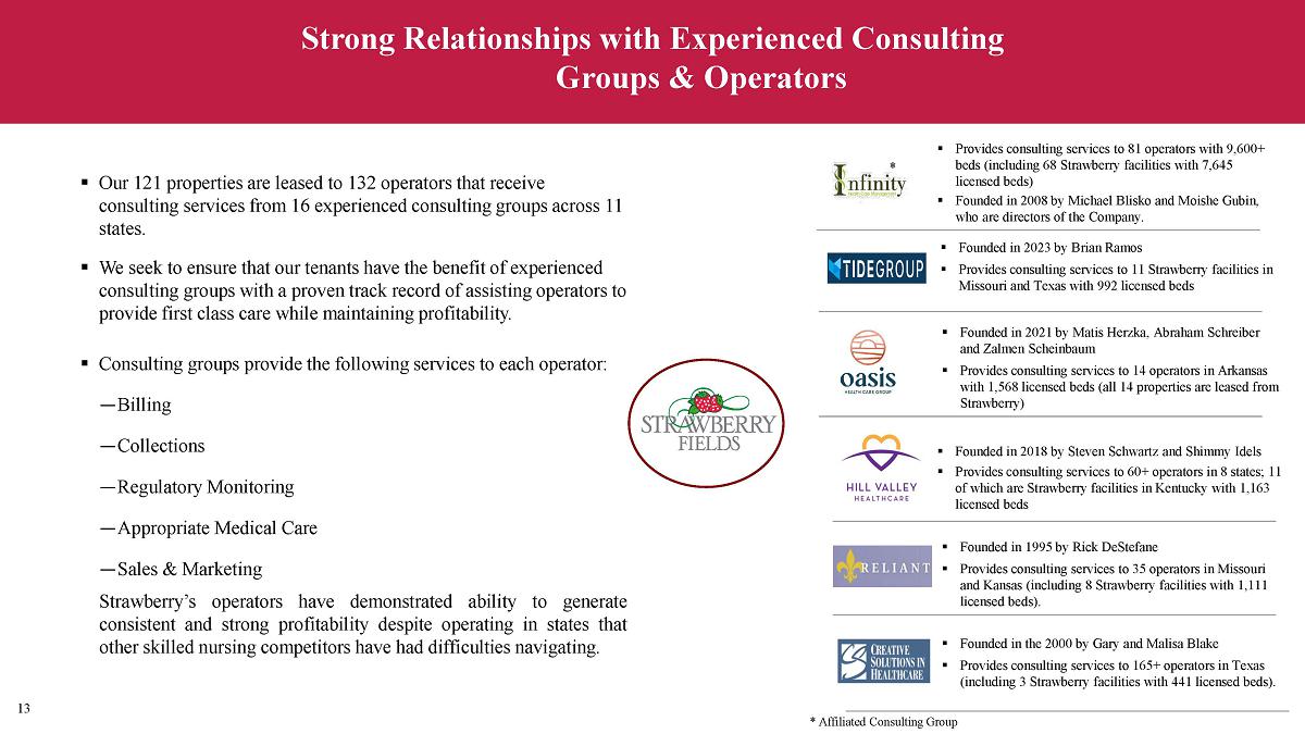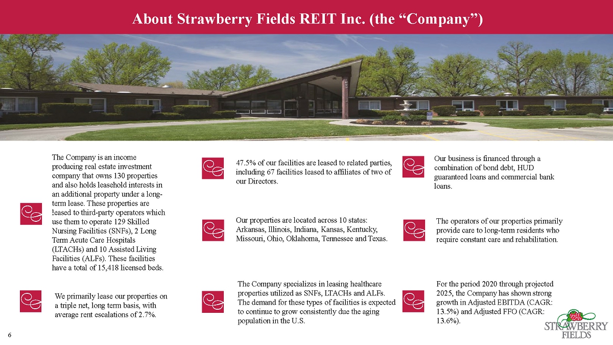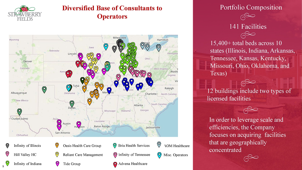 Strawberry Fields REIT, Inc., is a self-administered real estate investment trust engaged in the ownership, acquisition, development and leasing of skilled nursing and certain other healthcare-related properties. The Company’s portfolio includes 141 healthcare facilities with an aggregate of 15,400+ beds, located throughout the states of Arkansas, Illinois, Indiana, Kansas, Kentucky, Missouri, Ohio, Oklahoma, Tennessee and Texas. The 140 healthcare facilities comprise 129 skilled nursing facilities, eight assisted living facilities, and two long-term acute care hospitals.