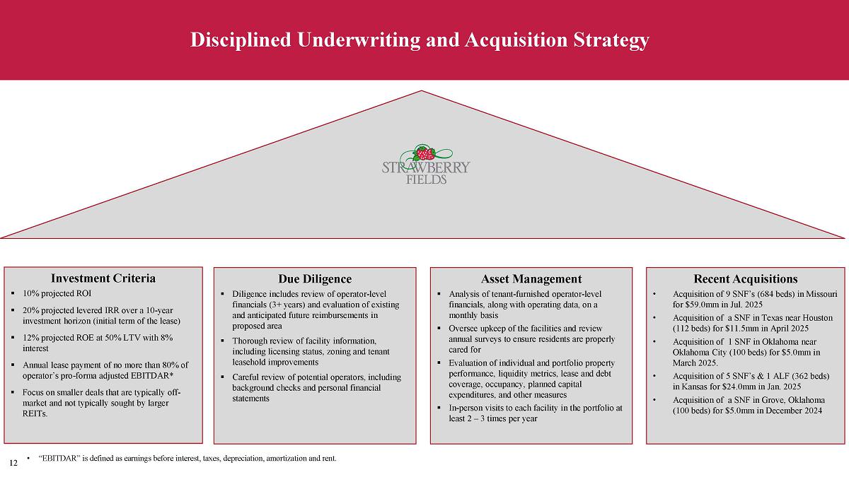 | ● | On May 22, 2025, the Company entered into a $59,000,000 purchase agreement for nine skilled nursing facilities, comprised of 686 beds, located in Missouri. Eight of the facilities will be added to the Tide Group’s master lease the Company entered into in August 2024. This acquisition will increase Tide Group’s annual rents by $5.5 million. The ninth facility will be added to the Reliant Care Group L.L.C.’s master lease the Company assumed in December 2024 increasing their annual rents by $0.6 million. The Company closed on the acquisition on July 1, 2025 and funded the acquisition utilizing working capital. |
