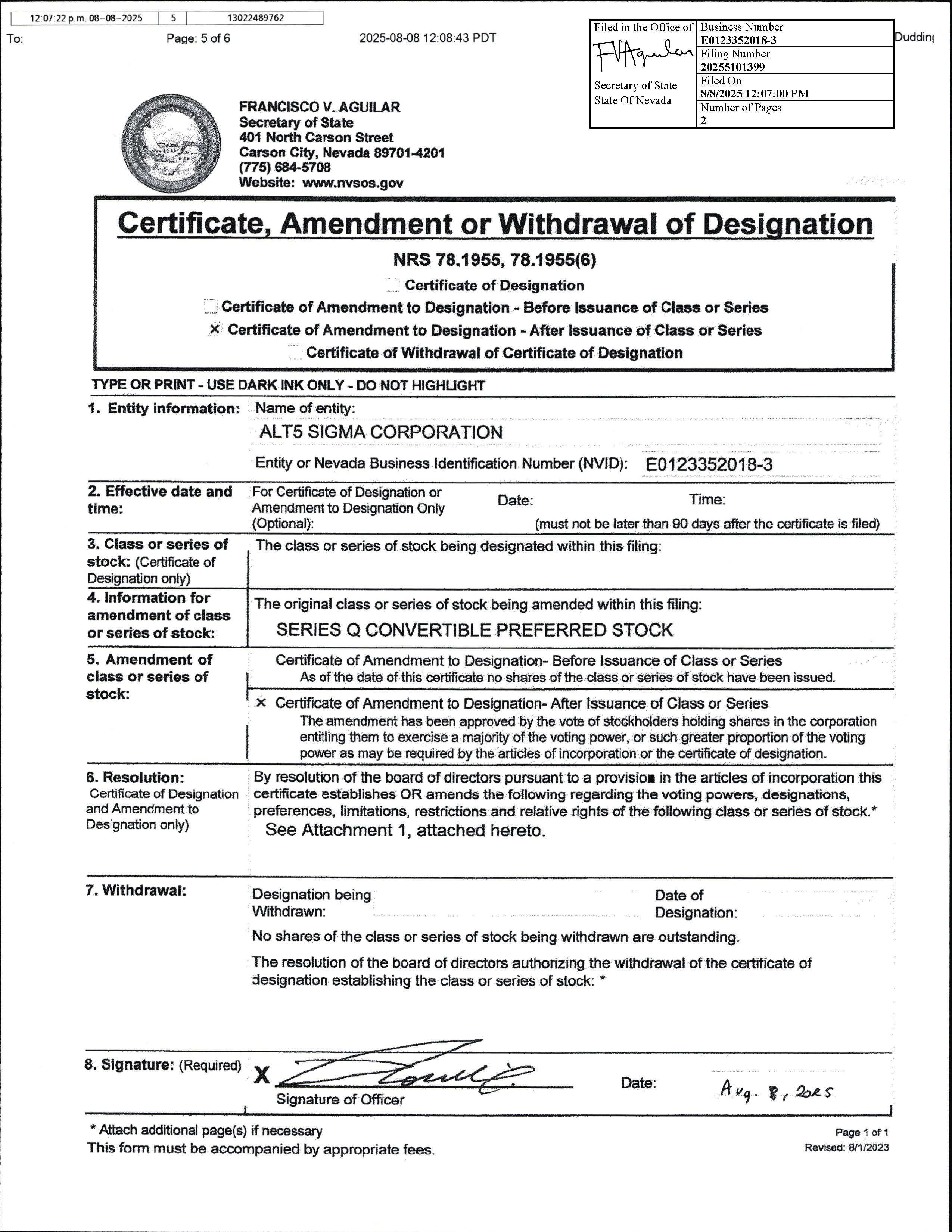本普通株式購入ワラント(以下、「ワラント」という)は、A.G.P./ALLIANCE GLOBAL PARTNERSまたはその譲受人(以下、「保有者」という)が、2025年[*]以降(以下、「当初行使日」という)、2030年[*]午後5時(ニューヨーク市時間)以前であればいつでも、受領した対価に基づき、以下に定める条件および行使制限に従って、ALT5 Sigma Corporation(以下、「ネバダ州法人」という)から普通株式を引き受け、購入する権利を有することを証明するものである。(以下、「本新株予約権」という。)を引き受け、ネバダ州法人ALT5 Sigma Corporation(以下、「当社」という。)から1株当たり額面0.001ドルの当社普通株式(以下、「普通株式」という。)を[*]株(以下、「本新株予約権株式」という。)を上限として購入することができる。本新株引受権に基づく普通株式1株の購入価格は、第2条(b)に定義される行使価格と同額とする。本新株引受権は、当社と保有者との間で締結された2025年8月[*]日付けのプレースメント・エージェンシー契約(その条項に従って随時修正、変更、補足、その他の変更がなされる可能性があり、以下「プレースメント・エージェンシー契約」という)の第3条(B)に従って発行された。
