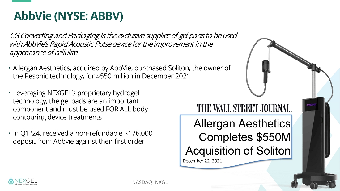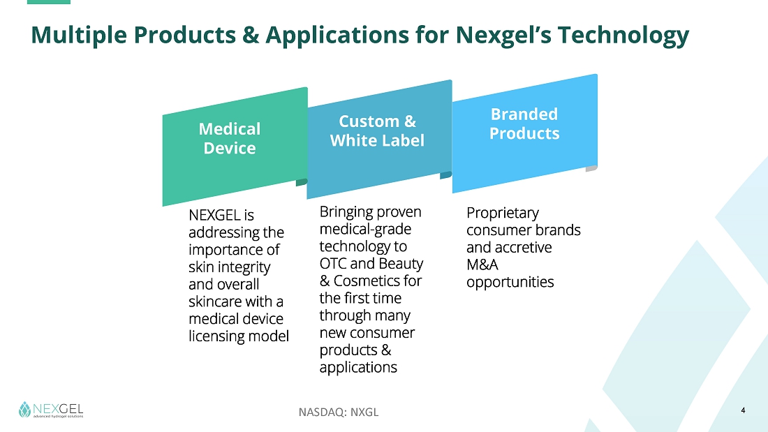 NEXGEL社は、ヘルスケア、美容、一般用医薬品(OTC)のリーディング・プロバイダーであり、超柔軟で高含水量のハイドロゲルを含む。米国ペンシルベニア州ラングホーンに拠点を置き、20年以上にわたり電子線架橋型ハイドロゲルの開発・製造を行っている。NEXGELブランドには、SilverSeal®、Hexagels®、Turfguard®、Kenkoderm®、Silly George®などがある。また、NEXGELは大手消費者向けヘルスケア企業と戦略的な製造委託契約を結んでいます。