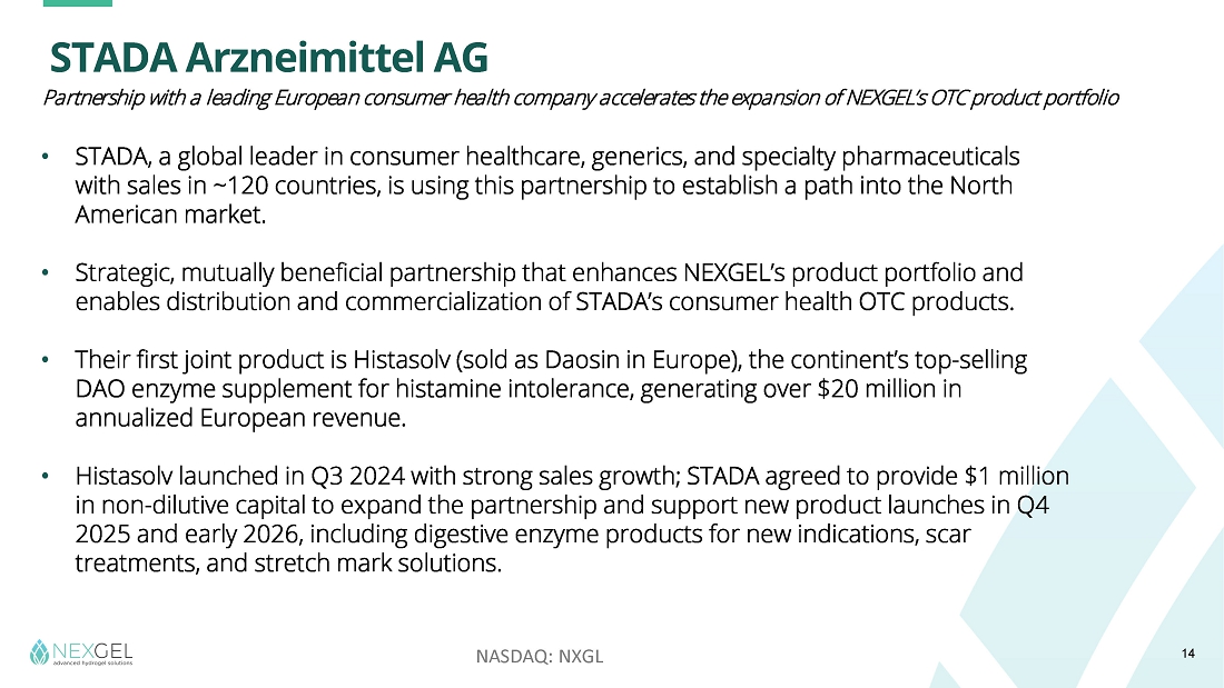 「2025 年第 2 四半期は、季節的に好調な下半期に向かう中、調整後 EBITDA の損失は着実に減少し、好調な売上高と売上総利益率を計上しました。前年同期比で増収となったのは、当社ブランド製品に対する消費者需要の伸びと、受託製造における新規契約によるものです。ネクセルの最高経営責任者(CEO)であるアダム・レヴィは、「ネクセルの事業の両部門において、2025年下半期には、当社ブランドの新しい消費者向け製品の発売が開始されるとともに、当社の強固なパイプラインに新たな製造委託先が加わるため、大きな成長機会が見込まれます。「当四半期後、STADA とのパートナーシップを拡大し、製品発売とマーケティング活動を支援するため、100 万ドルの非希薄化資本を調達しました。さらに、総収入105万ドルの資金調達も完了し、今後の成長イニシアチブをサポートするのに十分なものとなりました。2025年の売上高1,300万ドル、年間EBITDAプラス達成という以前発表したガイダンスに引き続き自信を持っています。"