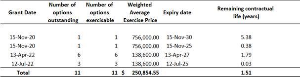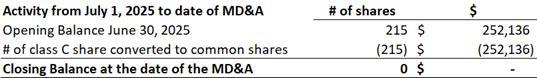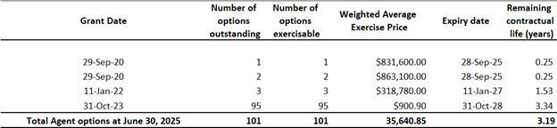 As at June 30, 2025 and of the date of the filing of this Annual Report, agent’s options outstanding and exercisable are as follows: