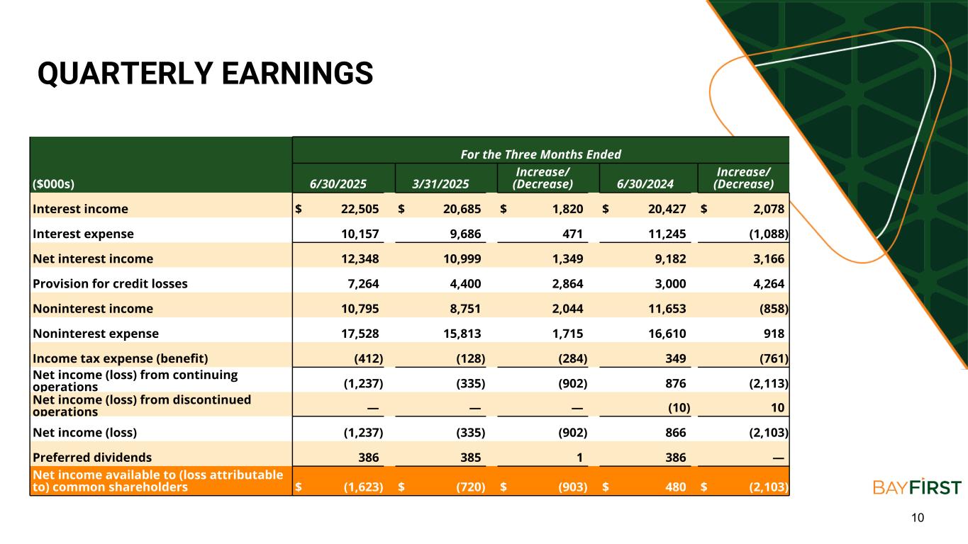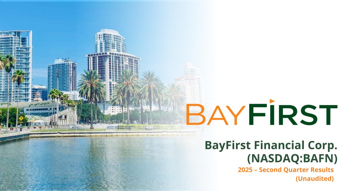 ST. PETERSBURG, FL. — July 29, 2025 — BayFirst Financial Corp. (NASDAQ: BAFN) (“BayFirst” or the “Company”), parent company of BayFirst National Bank (the “Bank”) today reported a net loss of $1.2 million, or $(0.39) per common share and diluted common share, for the second quarter of 2025, compared to a net loss of $0.3 million, or $(0.17) per common share and diluted common share, in the first quarter of 2025.