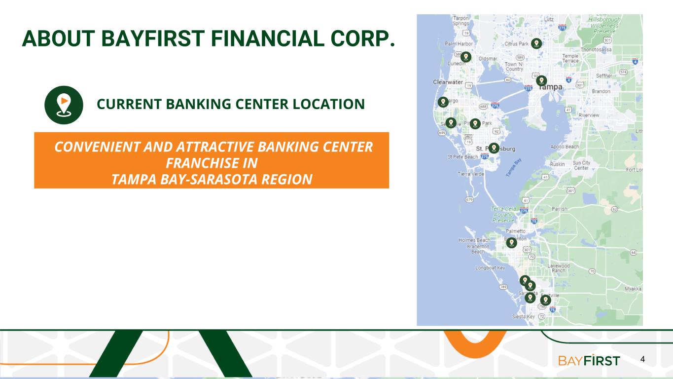 BayFirst Financial Corp. is a registered bank holding company based in St. Petersburg, Florida which commenced operations on September 1, 2000. Its primary source of income is derived from its wholly owned subsidiary, BayFirst National Bank, a national banking association which commenced business operations on February 12, 1999. The Bank currently operates twelve full-service banking offices throughout the Tampa Bay-Sarasota region and offers a broad range of commercial and consumer banking services to businesses and individuals. The Bank was the 8th largest SBA 7(a) lender by number of units originated and 18th largest by dollar volume nationwide through the SBA's quarter ended June 30, 2025. As of June 30, 2025, BayFirst Financial Corp. had $1.34 billion in total assets.