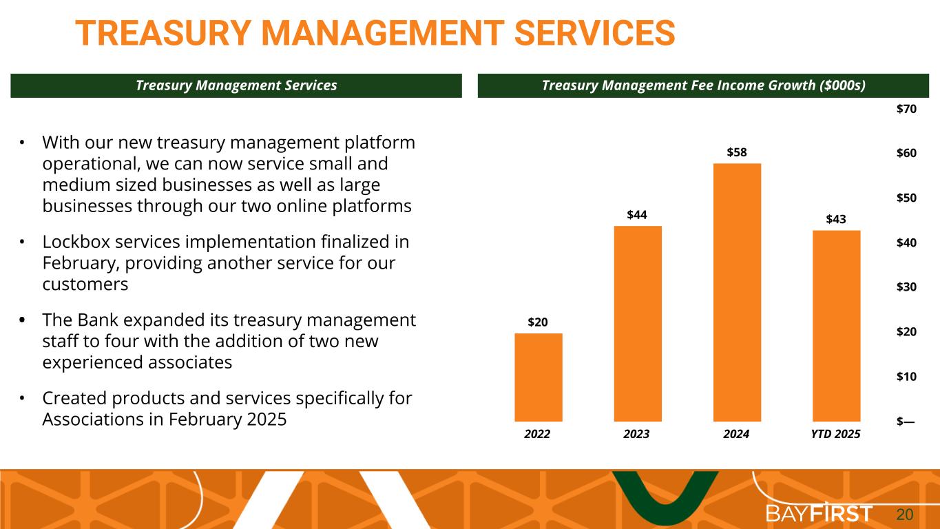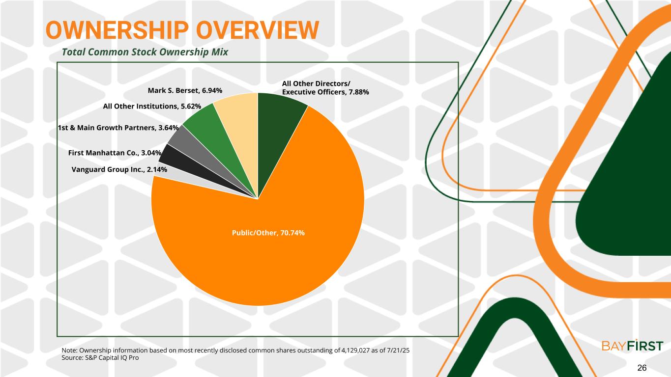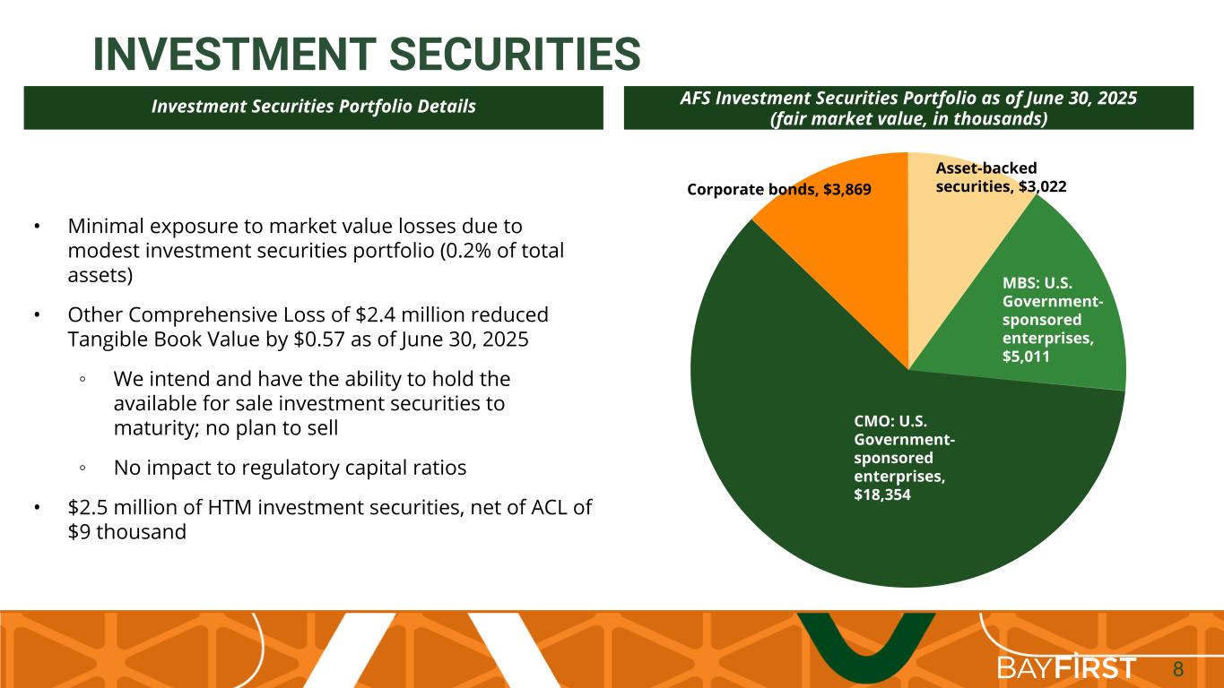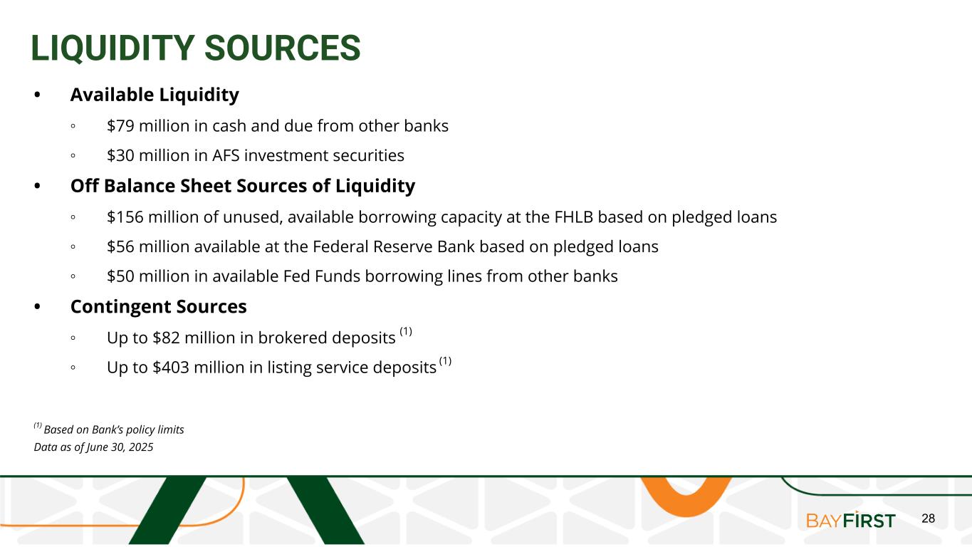 “We continue to support our community bank first and foremost, serving individuals, families, and small businesses with a strong emphasis on stable, low-cost checking and savings accounts—products that are less sensitive to rate changes and contribute to a more predictable funding base,” said Zernick. “This focus not only supports relationship-driven banking but also broadens our reach across the vibrant Tampa Bay region, enhancing our franchise and creating more opportunities to offer residential mortgages, consumer loans, and small business financing. During the second quarter, we continued to focus on growing core deposits. This is a key component of our broader strategy to increase recurring revenue through net interest income and reduce our reliance on gains from the sale of government-guaranteed loans. As we continue to expand our conventional commercial and consumer loan portfolios, we are also taking proactive steps to manage credit risk. These efforts include strengthening underwriting standards for SBA 7(a) loans and exploring options such as portfolio sales to reduce exposure to unguaranteed SBA balances. We remain focused on aligning our loan growth with strong risk oversight to support long-term performance.