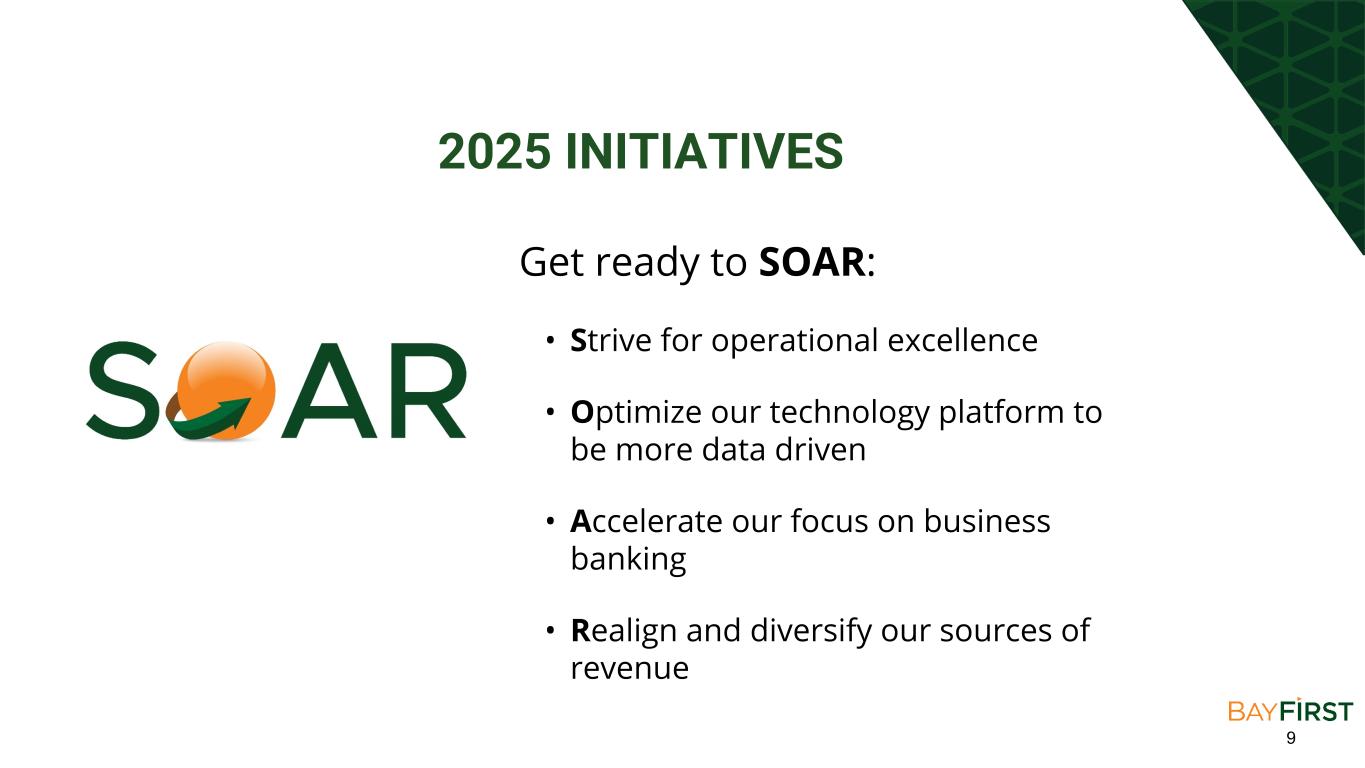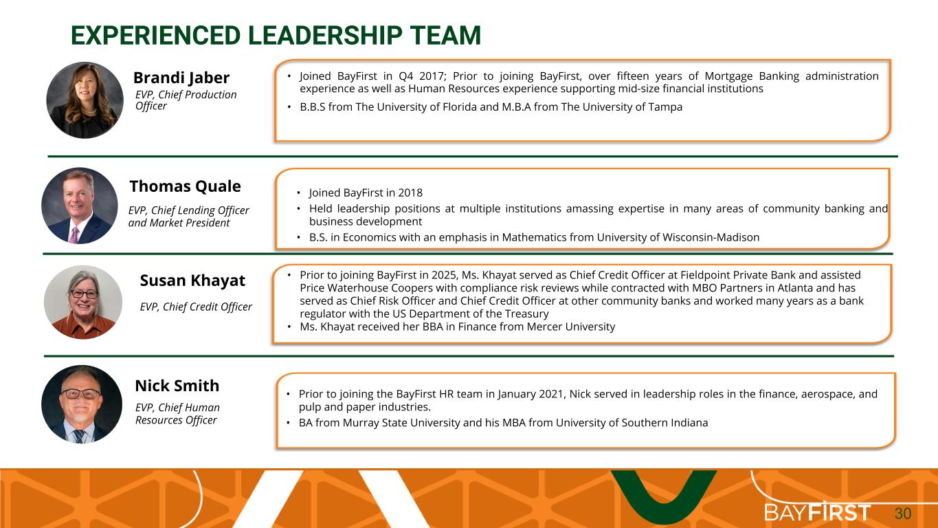 “As we announced last quarter, Management and the Board initiated a comprehensive strategic review aimed at derisking unguaranteed SBA 7(a) balances on the balance sheet and positioning the company for long-term growth and enhanced shareholder value,” stated Thomas G. Zernick, Chief Executive Officer. “Much progress is being made, and we expect to have additional information on our plans and the expected results in the coming weeks. In conjunction with the review, BayFirst reported charge offs and fair value write downs on related SBA 7(a) loans with elevated levels of risk. This will provide for a stronger balance sheet to take advantage of community banking opportunities. Furthermore, to offset the impact of these changes, the Board has voted to suspend common and preferred stock dividend payments and board of director fees. We will continue to evaluate strategic alternatives to ensure an optimal path in the best long-term interests of our shareholders, customers, and the communities we serve.