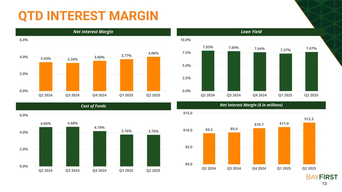 Net interest income from continuing operations was $12.3 million in the second quarter of 2025, an increase from $11.0 million during the first quarter of 2025, and an increase from $9.2 million during the second quarter of 2024. The net interest margin was 4.06% in the second quarter of 2025, an increase of 29 basis points from 3.77% in the first quarter of 2025 and an increase of 63 basis points from 3.43% in the second quarter of 2024.