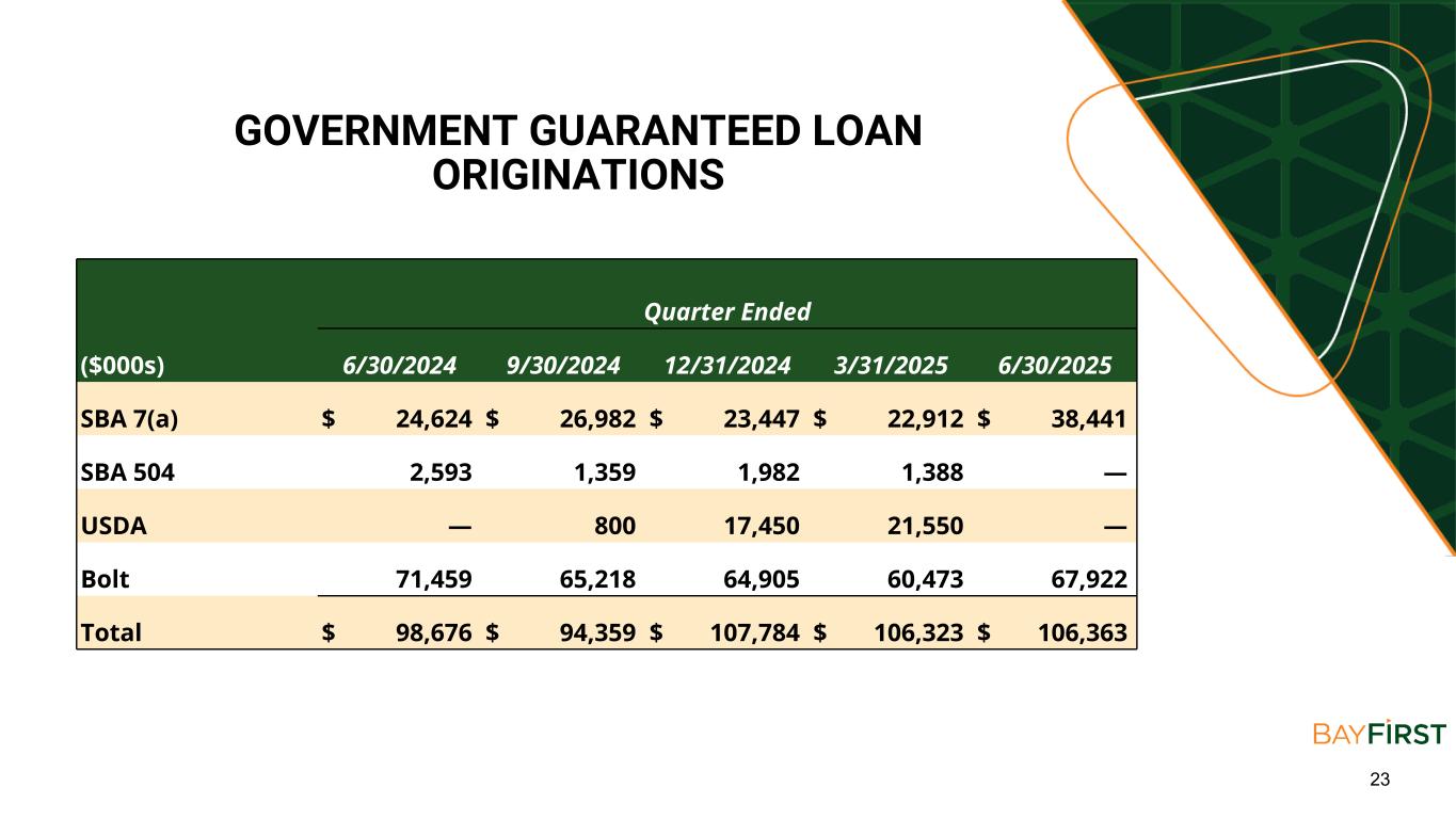 •The Company’s government guaranteed loan team originated $106.4 million in new loans during the second quarter of 2025, a slight increase from $106.3 million of loans produced in the previous quarter, and an increase from $98.7 million of loans produced during the second quarter of 2024. Since the launch in 2022 of the Company's Bolt loan program, an SBA 7(a) loan product designed to expeditiously provide working capital loans of $150 thousand or less, the Company has originated 6,745 Bolt loans totaling $869.9 million, of which 538 Bolt loans totaling $67.9 million were originated during the second quarter.