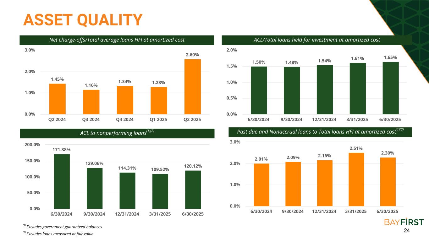 Net charge-offs for the second quarter of 2025 were $6.8 million, which was an increase from $3.3 million for the first quarter of 2025 and the second quarter of 2024. Annualized net charge-offs as a percentage of average loans held for investment at amortized cost were 2.60% for the second quarter of 2025, compared to 1.28% in the first quarter of 2025 and 1.45% in the second quarter of 2024. Nonperforming assets were 1.79% of total assets as of June 30, 2025, compared to 2.08% as of March 31, 2025, and 1.28% as of June 30, 2024. Nonperforming assets, excluding government guaranteed loan balances, were 1.12% of total assets as of June 30, 2025, compared to 1.22% as of March 31, 2025, and 0.82% as of June 30, 2024.