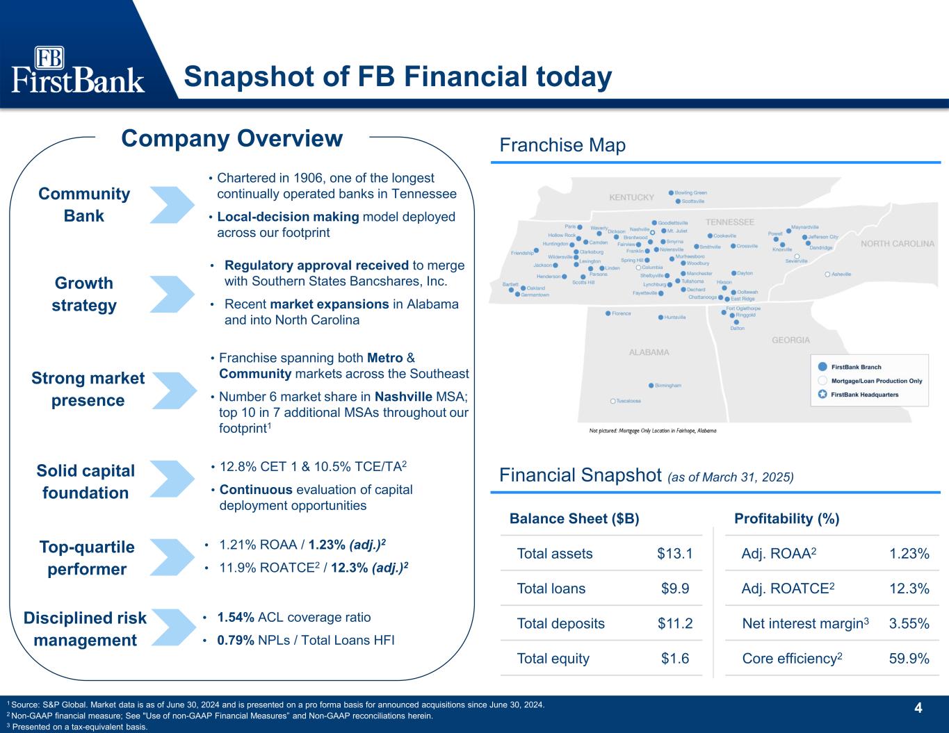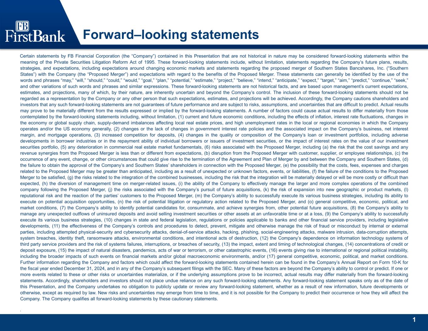 This communication does not constitute an offer to buy or sell, or the solicitation of an offer to buy or sell, any securities or a solicitation of any vote or approval. In connection with the Proposed Merger, FB Financial filed a Registration Statement on Form S-4 with the SEC on May 8, 2025, as amended on May 19, 2025 (and which is available at https://www.sec.gov/Archives/edgar/data/0001649749/000110465925050527/tm2513910-3_s4a.htm) to register the shares of FB Financial common stock to be issued in the Proposed Merger. The Registration Statement includes a joint proxy statement of FB Financial and Southern States that also constitutes a prospectus of FB Financial.