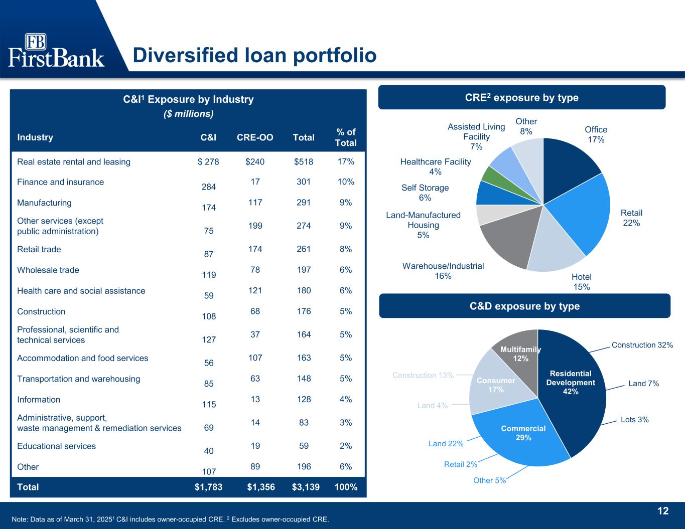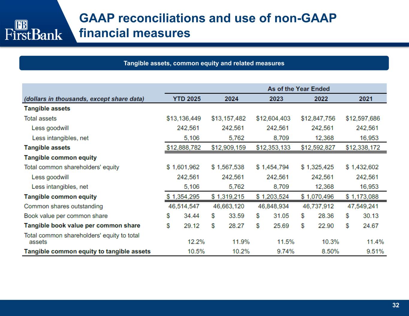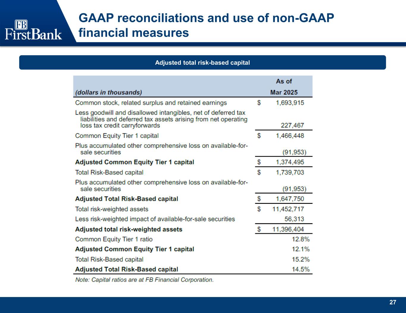 FB Financial Corporation (NYSE: FBK) is a bank holding company headquartered in Nashville, Tennessee. FB Financial operates through its wholly owned banking subsidiary, FirstBank, with 77 full-service bank branches across Tennessee, Alabama, Kentucky, and North Georgia, and mortgage offices across the Southeast. FB Financial Corporation has approximately $13.1 billion in total assets as of March 31, 2025.
