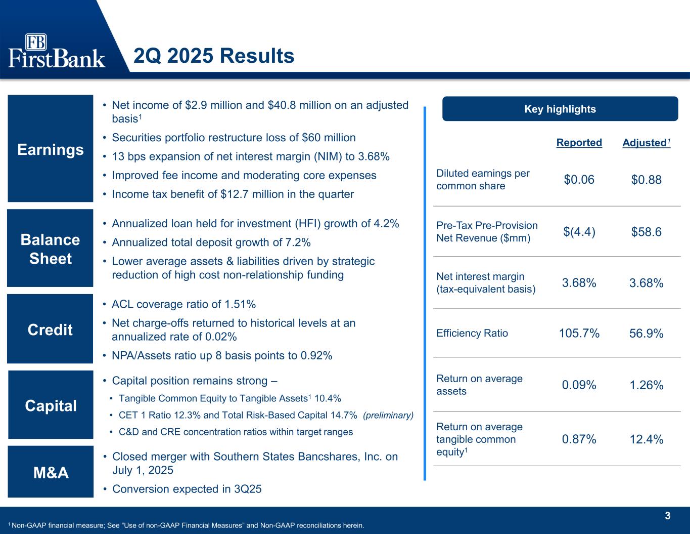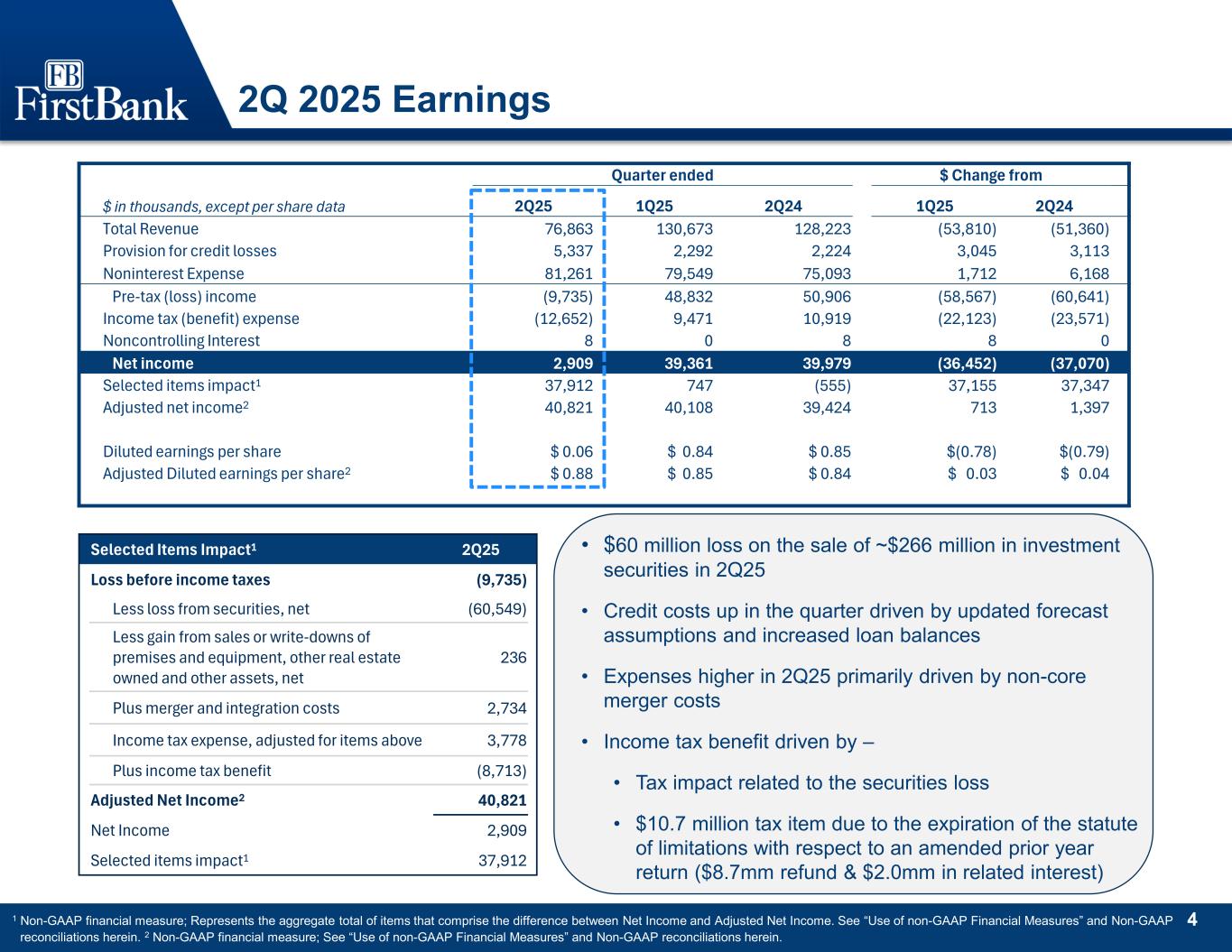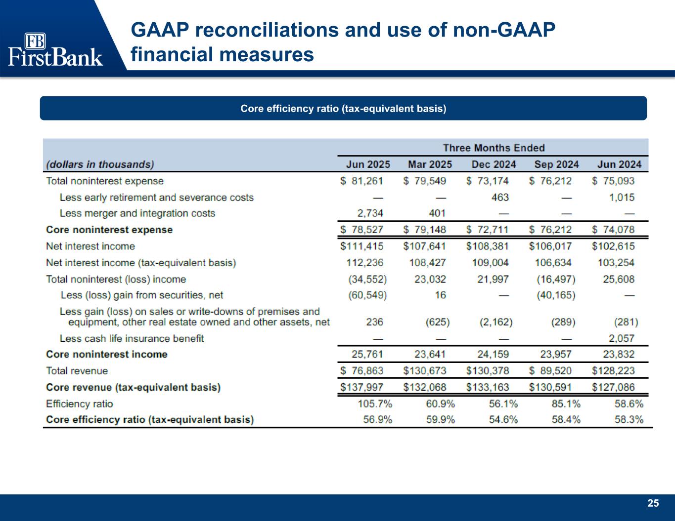 投資家の皆様におかれましては、当社ウェブサイト(https://investors.firstbankonline.com)に掲載されている2025年第2四半期決算補足資料および決算説明資料と併せて、本決算説明資料をご覧ください。本決算発表資料、2025年第2四半期財務補足資料および決算説明資料は、当社が2025年7月14日に米国証券取引委員会(SEC)に提出したForm 8-KのCurrent Reportにも含まれています。