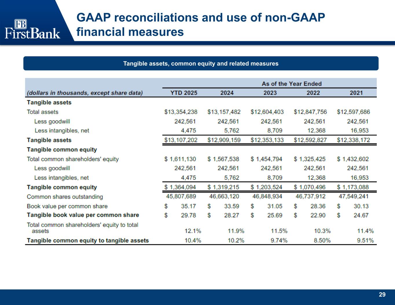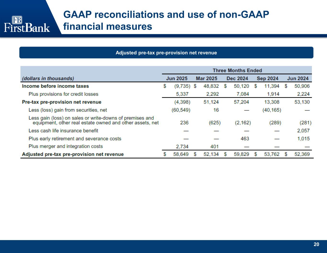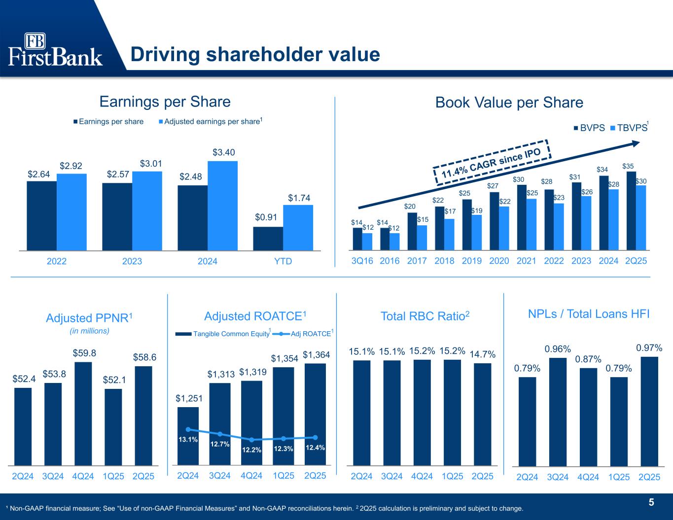 投資家の皆様におかれましては、当社ウェブサイト(https://investors.firstbankonline.com)に掲載されている2025年第2四半期決算補足資料および決算説明資料と併せて、本決算説明資料をご覧ください。本決算発表資料、2025年第2四半期財務補足資料および決算説明資料は、当社が2025年7月14日に米国証券取引委員会(SEC)に提出したForm 8-KのCurrent Reportにも含まれています。