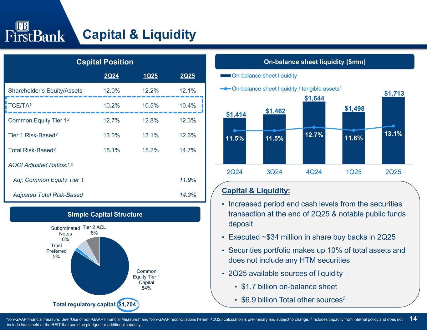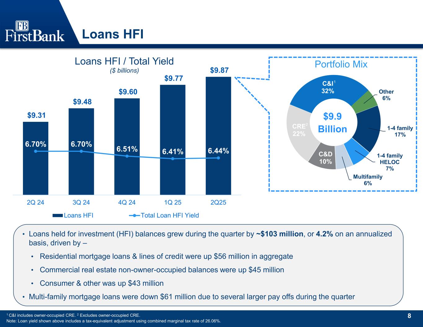2025年第2四半期末の投資目的貸出(HFI)は98.7億ドルで、前期末の97.7億ドル(年率4.22%増)、前年同期末の 93.1億ドル(同6.07%増)より増加した。2025年6月30日現在の預金残高は114.0億ドルで、2025年3月31日現在の112.0億ドル(年率7.21%増)、2024年6月30日現在の104.7億ドル(同8.94%増)と比べて増加しました。2025年第2四半期の純利鞘(NIM)は3.68%で、前四半期は3.55%、2024年第2四半期は3.57%でした。当社は6月に売却可能債券2億6,650万ドルの売却を選択し、GAAP基準では6,050万ドルの損失となり ました。当四半期末の普通株式1株当たり簿価は35.17ドル、普通株式1株当たり有形簿価*は29.78ドルであった。