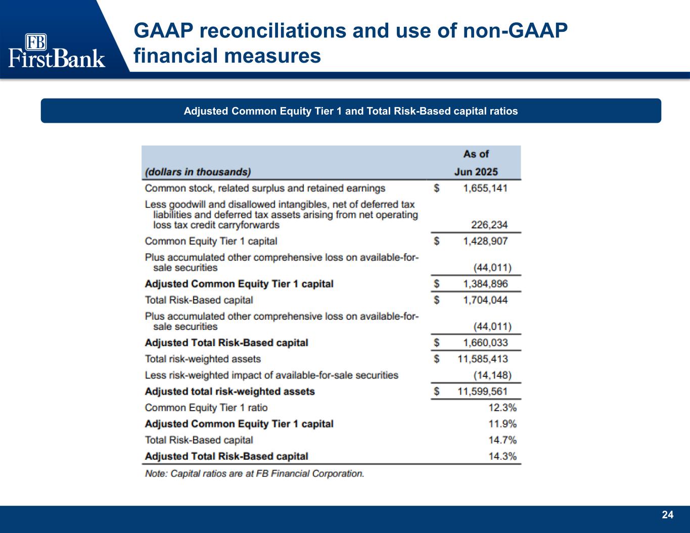 テネシー州ナッシュビル-2025 年 7 月 14 日--ファーストバンクの親会社である FB フィナンシャ ル・コーポレーション(以下「当社」)(NYSE: FBK)は、2025 年第 2 四半期の純利益を、前四半期の 0.84 ドル、前年同期の 0.85 ドルに対し、290 万ドル(希薄化後普通株式 1 株当たり 0.06 ドル)と報告した。調整後純利益*は4,080万ドル(希薄化後普通株式1株当たり0.88ドル)で、前期は0.85ドル、前年同期は0.84ドルでした。2025年度第2四半期の調整後税引前・引当金調整前純収入*は5,860万ドルで、前期の5,210万ドルおよび前年同期の5,240万ドルからそれぞれ12.5%および12.0%増加しました。