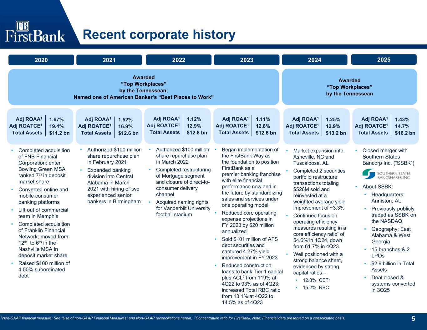 3 Snapshot of FB Financial today 1 Source: S&P Global. Market data is as of June 30, 2025 and is presented on a pro forma basis for announced acquisitions since June 30, 2025. 2 Non-GAAP financial measure; See "Use of non-GAAP Financial Measures” and Non-GAAP reconciliations herein. 3 Presented on a tax-equivalent basis. Company Overview Community Bank Solid capital foundation Growth strategy Disciplined risk management Top-quartile performer • 11.7% CET1 (preliminary) & 10.1% TCE/TA2 • Continuous evaluation of capital deployment opportunities • 0.58% ROAA / 1.43% (adj.)2 • 5.82% ROATCE2 / 14.7% (adj.)2 • Completed merger with Southern States Bancshares, Inc. • Recent market expansions in Alabama and into North Carolina • 1.50% ACL coverage ratio • 0.94% NPLs / Total Loans HFI • Chartered in 1906, one of the longest continually operated banks in Tennessee • Local-decision making model deployed across our footprint Balance Sheet ($B) $16.2Total assets $12.5Total loans $13.8Total deposits $2.0Total equity Profitability (%) 1.43%Adj. ROAA2 14.7%Adj. ROATCE2 3.95%Net interest margin3 53.3%Core efficiency2,3 Strong market presence • Franchise spanning both Metro & Community markets across the Southeast • Number 6 market share in Nashville MSA; top 10 in 7 additional MSAs throughout our footprint1 Financial Snapshot (as of September 30, 2025 QTD) Franchise Map Not pictured: Mortgage Only Location in Fair Hope, Alabama.