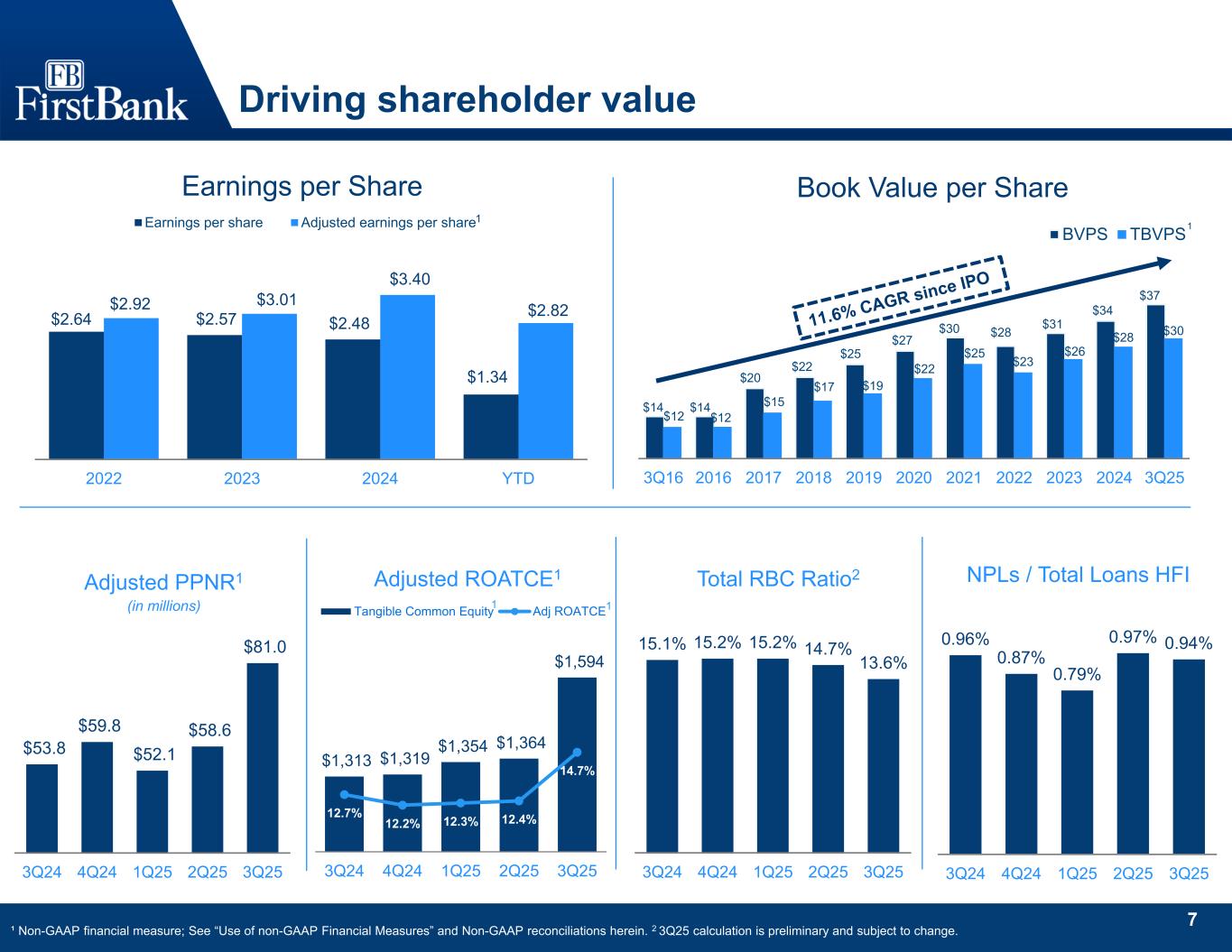 6 Well-positioned for organic growth in desirable markets Growing deposit franchise 1Source: S&P Global. Market data is as of June 30, 2024 and is presented on a pro forma basis for announced acquisitions since June 30, 2024. 2Source: S&P Global. Market data is as of June 30, 2025 and is presented on a pro forma basis for announced acquisitions since June 30, 2025. 3Source: S&P Global. FBK Footprint is based on weighted average demographics of MSAs and counties not located in MSAs with weightings based on deposits in each market as of June 30, 2025. (P) represents projected information. 3.6% 6.4% 9.0% U.S. FBK Footprint Nashville Population change3 2020 - 2026 2.6% 4.2% 5.7% U.S. FBK Footprint Nashville Population Change (P)3 2026 - 2031 11.3% 11.7% 14.7% U.S. FBK Footprint Nashville Household Income Change (P)3 2026 - 2031 91 full-service branches $13.8 billion deposits Previous1 6thNashville 5thChattanooga 9thKnoxville 3rdJackson, TN 7thBowling Green, KY 21stBirmingham, AL 21stHuntsville, AL 28thMemphis, TN 9thFlorence, AL Current2 6thNashville 5thChattanooga 9thKnoxville 3rdJackson, TN 5thAuburn/Opelika, AL 4th Columbus, GA 8thBowling Green 16thBirmingham, AL 16thHuntsville, AL 28thMemphis, TN 24thAtlanta, GA Green = change since previous market share reporting.