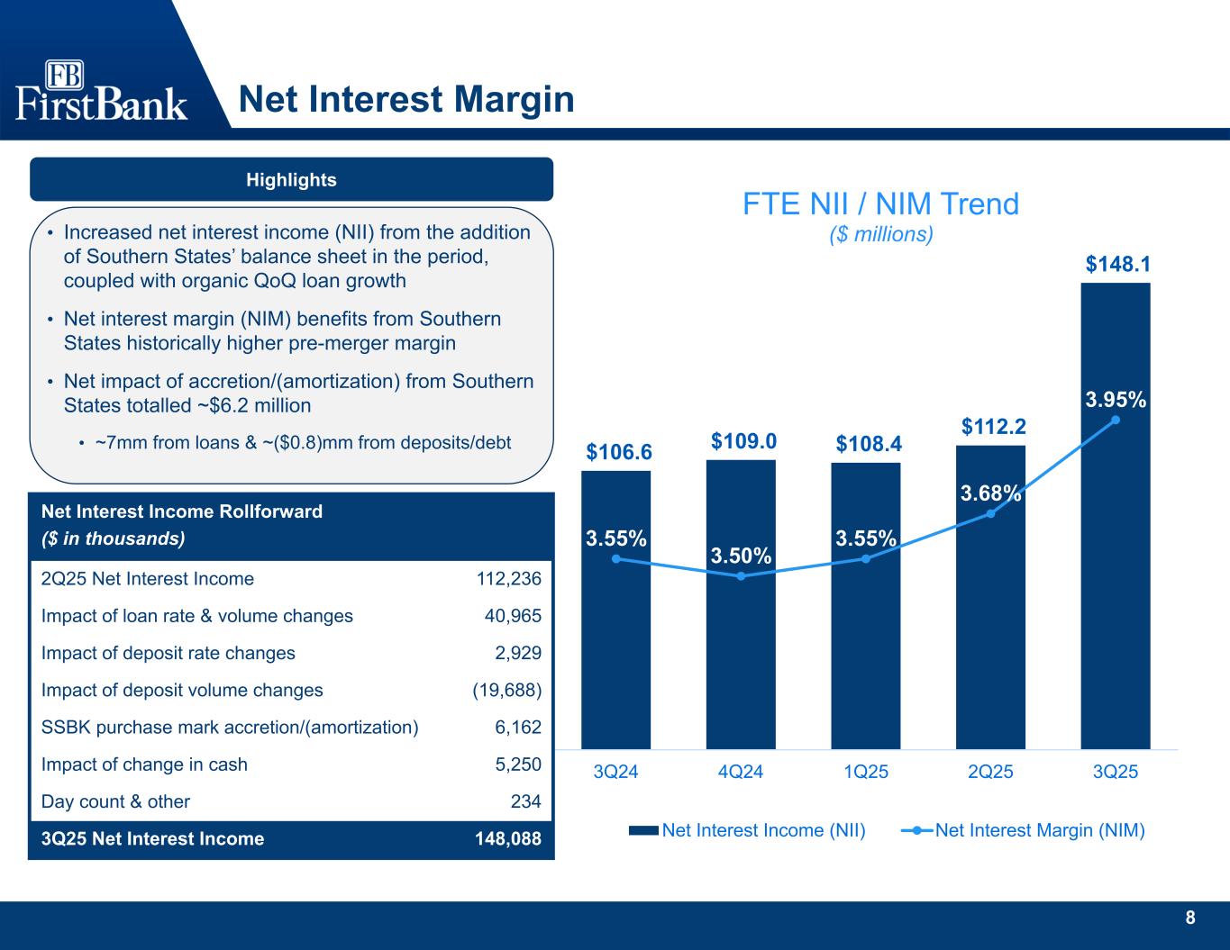 18 FBK & SSBK Combination Summary Deal Announced March 31, 2025 Regulatory Approval June 12, 2025 Shareholder Approval June 26, 2025 Legal Close July 1, 2025 System Conversion Completed Sept. 2, 2025 Merger timeline: Merger update: Deal closed July 1, 2025 ~90 days from announcement to close System conversion complete Deal synergies finalized Deal economics remain solid All team members onboarded & working as one organization All clients converted & being served under FirstBank brand StatusDeal AssumptionsDeal metrics 3Q 25 close & conversion 4Q25Close timeline 50% in 2025 100% in 2026 100% thereafter 25% in 2025 75% in 2026 100% thereafter Cost savings Better than expected~$38 millionTransaction Costs Better than expected~12%2026 EPS accretion On track~50%2026 Efficiency ratio On track< (4.0%)Tangible book value per share dilution (%) Better than expected< 2 yearsTBV earn back 1 Represents transaction costs recorded at Southern States pre-close and costs recorded at FBK pre & post close.