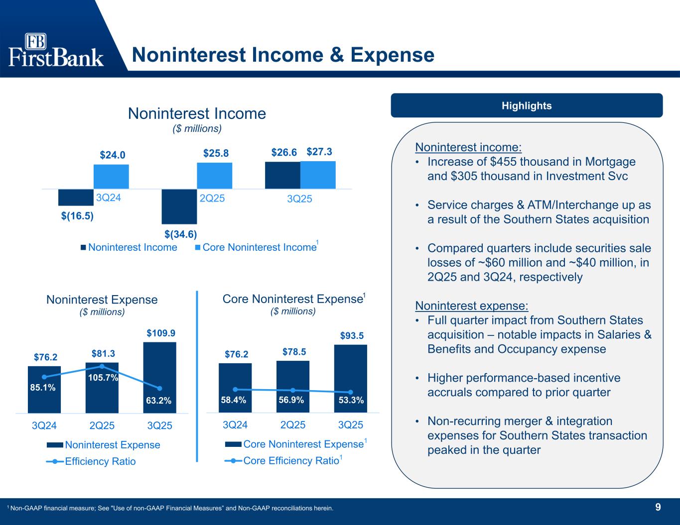 8 Net Interest Margin $106.6 $109.0 $108.4 $112.2 $148.1 3.55% 3.50% 3.55% 3.68% 3.95% 3Q24 4Q24 1Q25 2Q25 3Q25 FTE NII / NIM Trend ($ millions) Net Interest Income (NII) Net Interest Margin (NIM) Highlights Net Interest Income Rollforward ($ in thousands) 112,2362Q25 Net Interest Income 40,965Impact of loan rate & volume changes 2,929Impact of deposit rate changes (19,688)Impact of deposit volume changes 6,162SSBK purchase mark accretion/(amortization) 5,250Impact of change in cash 234Day count & other 148,0883Q25 Net Interest Income • Increased net interest income (NII) from the addition of Southern States’ balance sheet in the period, coupled with organic QoQ loan growth • Net interest margin (NIM) benefits from Southern States historically higher pre-merger margin • Net impact of accretion/(amortization) from Southern States totalled ~$6.2 million • ~7mm from loans & ~($0.8)mm from deposits/debt