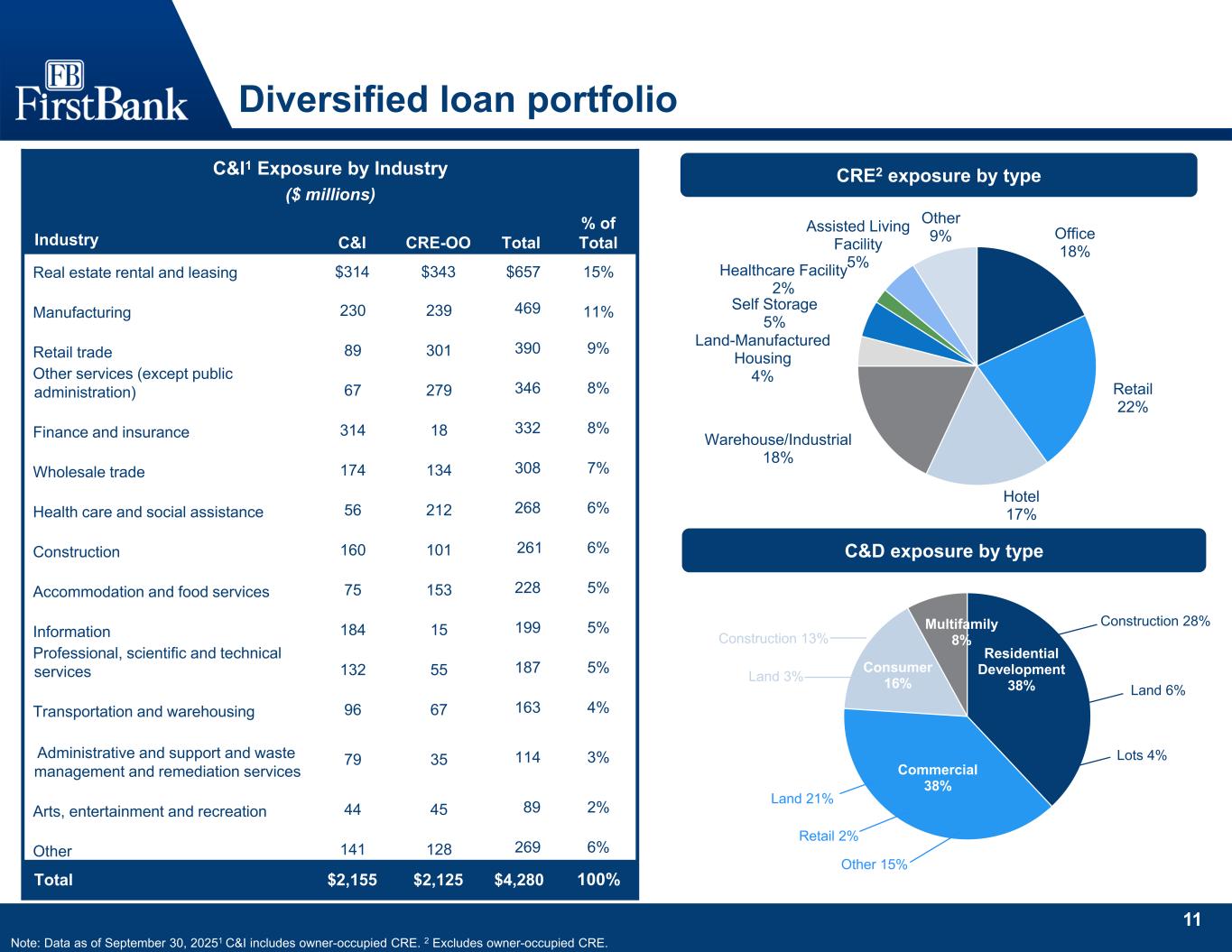 10 Loans HFI $9.48 $9.60 $9.77 $9.87 $12.30 6.70% 6.51% 6.41% 6.44% 6.75% 3Q 24 4Q 24 1Q 25 2Q25 3Q25 Loans HFI / Total Yield ($ billions) Loans HFI Total Loan HFI Yield 1-4 family 15% 1-4 family HELOC 6% Multifamily 6% C&D 10% CRE 23% C&I 35% Other 5% Portfolio Mix $12.3 Billion 1 C&I includes owner-occupied CRE. 2 Excludes owner-occupied CRE. Note: Loan yield shown above includes a tax-equivalent adjustment using combined marginal tax rate of 26.06%. 1 2 • ~$2.3 billion in loan HFI balances acquired during the quarter due to the completion of the Southern States merger • Organic loan growth in the combined company loan portfolio of ~$156mm, or 5% annualized • Notable organic growth categories include – Residential real-estate, Owner-occupied commercial real estate, and Consumer & Other • Lift in loan yield attributable to historically higher yield on acquired Southern States portfolio, coupled with new loan origination activity coming on at rates higher than the portfolio average