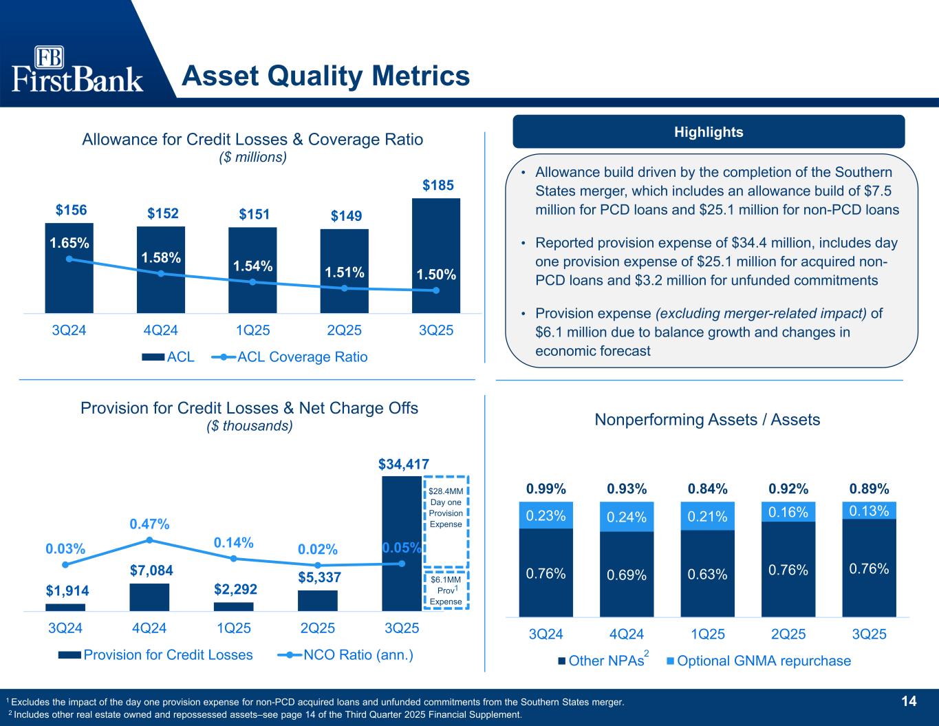 13 Valuable deposit base Cost of deposits 20.3% 18.9% 19.3% 19.2% 19.5% 2.83% 2.70% 2.54% 2.48% 2.53% 0.00% 0.50% 1.00% 1.50% 2.00% 2.50% 3.00% 0.0% 5.0% 10.0% 15.0% 20.0% 25.0% 30.0% 35.0% 3Q24 4Q24 1Q25 2Q25 3Q25 Noninterest-bearing as % of total deposits Cost of total deposits (%) Deposits by customer segment ($billions) • ~$2.5 billion in deposit balances acquired during the quarter due to the completion of the Southern States merger • Post-merger net deposit balances declined during the quarter by ~$59 million • Strategic run-off of higher cost non-relationship deposits & brokered deposit balances • Run-off balances partially replaced with core bank deposits generated through retail bank deposit gathering programs Highlights Noninterest -bearing checking 19% Interest- bearing checking 18% Money market & savings 43% Time 20% 37% Checking accounts 3Q25 Deposit composition $4.7 $4.9 $4.9 $4.8 $6.0 $4.9 $4.8 $4.7 $4.8 $6.0 $1.4 $1.6 $1.6 $1.8 $1.8 3Q24 4Q24 1Q25 2Q25 3Q25 Consumer Commercial Public $11.0 $11.3 $11.2 $11.4 $13.8