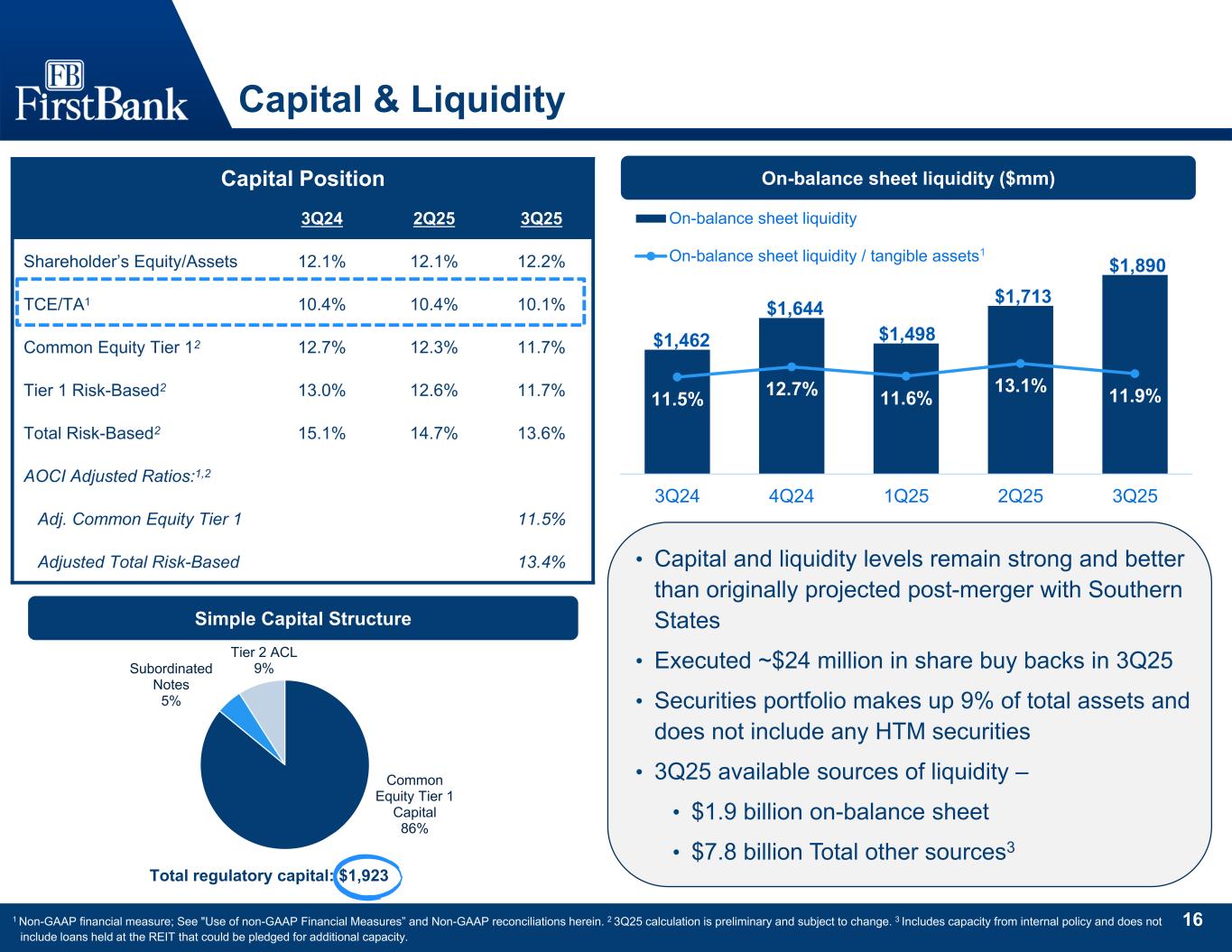 15 1.65% 1.43% 1.20% 0.87% 2.83% 1.47% 1.61% 1.81% 3.96% 1.51% 1.13% 1.20% 0.87% 2.14% 1.86% 1.82% 1.35% 3.10% 1.50% 1.21% 1.18% 0.96% 2.33% 1.60% 1.78% 1.48% 3.35% Gross Loans HFI Commercial & Industrial Non-Owner Occ CRE Owner Occ CRE Construction Multifamily 1-4 Family Mortgage 1-4 Family HELOC Consumer & Other 3Q24 2Q25 3Q25 Allowance Modeling & Reserve Allocation ACL on loans HFI / Loans HFI by category • QoQ decline in the National Housing Price Index (HPI) forecast assumption drove increased reserves in portfolios that correlate closely to that metric – namely Construction, HELOC, and portions of Consumer & Other • Other forecast assumptions remained relatively steady • 1.50% ACL coverage ratio at period end Key forecast inputs1 3Q262Q261Q264Q25 4.74.64.54.4National Unemployment Rate 1.41.31.31.1CRE Price Index (1.6)(1.2)2.31.2National Housing Price Index 5.86.06.36.5Prime Rate 1 Source: Moody’s “September 2025 U.S. Macroeconomic Outlook Baseline Scenario”, with the exception of the National Housing Price Index which also incorporates components of the Mortgage Bankers Association Mortgage Finance Forecast, September 2025.