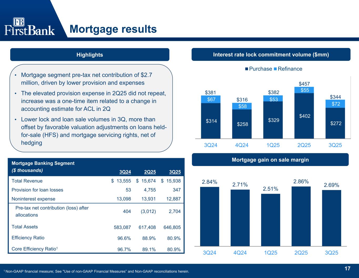 16 Capital & Liquidity Simple Capital Structure Common Equity Tier 1 Capital 86% Subordinated Notes 5% Tier 2 ACL 9% Total regulatory capital: $1,923 1 Non-GAAP financial measure; See "Use of non-GAAP Financial Measures” and Non-GAAP reconciliations herein. 2 3Q25 calculation is preliminary and subject to change. 3 Includes capacity from internal policy and does not include loans held at the REIT that could be pledged for additional capacity. On-balance sheet liquidity ($mm) $1,462 $1,644 $1,498 $1,713 $1,890 11.5% 12.7% 11.6% 13.1% 11.9% 3Q24 4Q24 1Q25 2Q25 3Q25 On-balance sheet liquidity On-balance sheet liquidity / tangible assets Capital Position 3Q252Q253Q24 12.2%12.1%12.1%Shareholder’s Equity/Assets 10.1%10.4%10.4%TCE/TA1 11.7%12.3%12.7%Common Equity Tier 12 11.7%12.6%13.0%Tier 1 Risk-Based2 13.6%14.7%15.1%Total Risk-Based2 AOCI Adjusted Ratios:1,2 11.5%Adj. Common Equity Tier 1 13.4%Adjusted Total Risk-Based 1 • Capital and liquidity levels remain strong and better than originally projected post-merger with Southern States • Executed ~$24 million in share buy backs in 3Q25 • Securities portfolio makes up 9% of total assets and does not include any HTM securities • 3Q25 available sources of liquidity – • $1.9 billion on-balance sheet • $7.8 billion Total other sources3