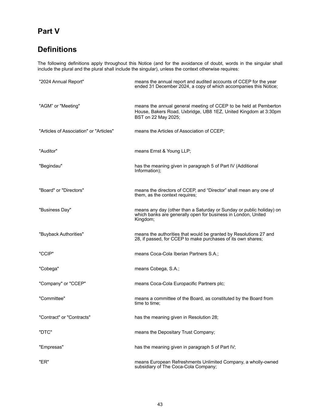 Part V Definitions The following definitions apply throughout this Notice (and for the avoidance of doubt, words in the singular shall include the plural and the plural shall include the singular), unless the context otherwise requires: "2024 Annual Report" means the annual report and audited accounts of CCEP for the year ended 31 December 2024, a copy of which accompanies this Notice; "AGM” or "Meeting" means the annual general meeting of CCEP to be held at Pemberton House, Bakers Road, Uxbridge, UB8 1EZ, United Kingdom at 3:30pm BST on 22 May 2025; "Articles of Association" or "Articles" means the Articles of Association of CCEP; "Auditor" means Ernst & Young LLP; "Begindau" has the meaning given in paragraph 5 of Part IV (Additional Information); "Board" or "Directors" means the directors of CCEP, and “Director” shall mean any one of them, as the context requires; "Business Day" means any day (other than a Saturday or Sunday or public holiday) on which banks are generally open for business in London, United Kingdom; "Buyback Authorities" means the authorities that would be granted by Resolutions 27 and 28, if passed, for CCEP to make purchases of its own shares; "CCIP" means Coca-Cola Iberian Partners S.A.; "Cobega" means Cobega, S.A.; "Company" or "CCEP" means Coca-Cola Europacific Partners plc; "Committee" means a committee of the Board, as constituted by the Board from time to time; "Contract" or "Contracts" has the meaning given in Resolution 28; "DTC" means the Depositary Trust Company; "Empresas" has the meaning given in paragraph 5 of Part IV; "ER" means European Refreshments Unlimited Company, a wholly-owned subsidiary of The Coca-Cola Company; 43