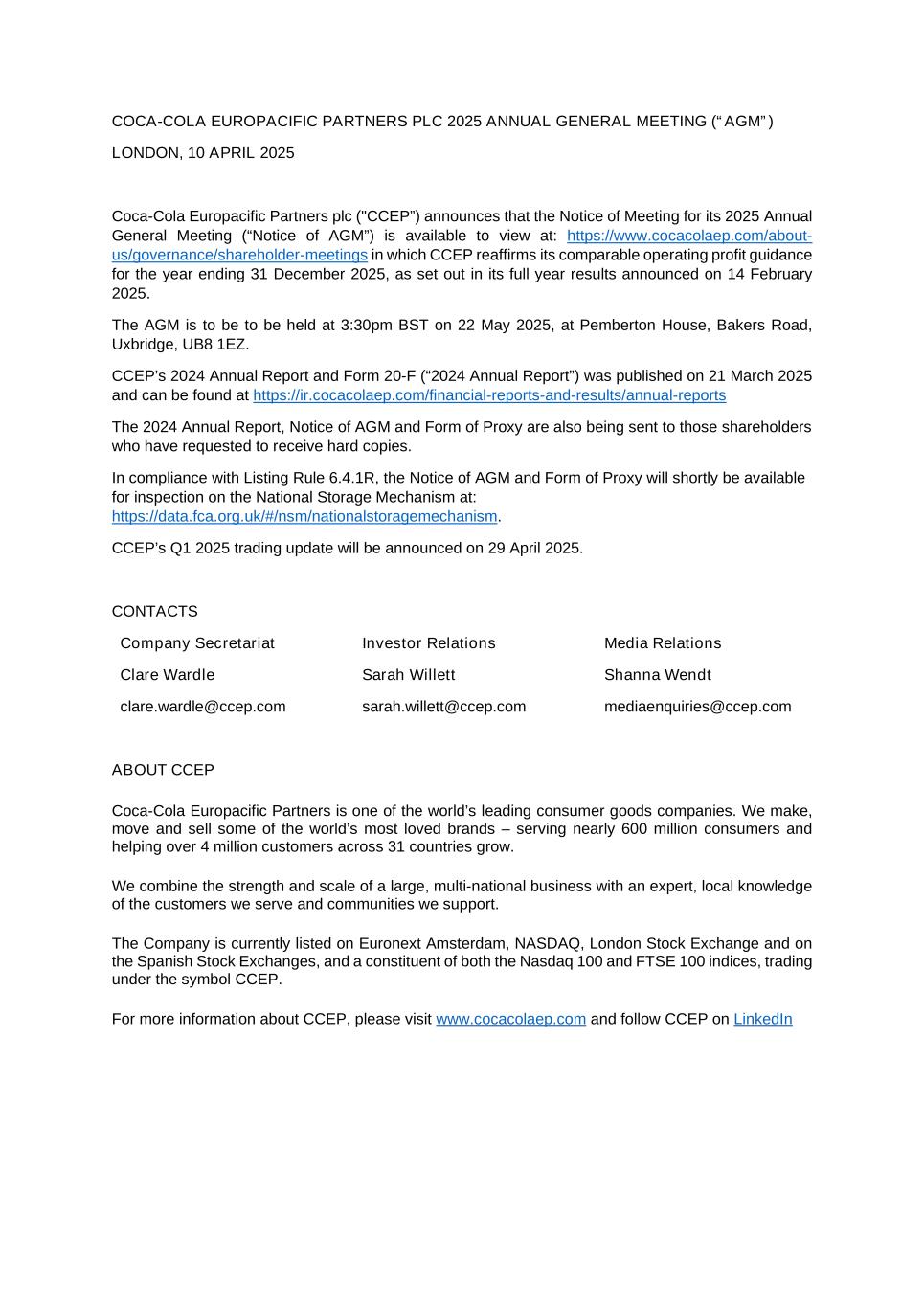 NOTICE OF ANNUAL GENERAL MEETING 2025 THIS DOCUMENT IS IMPORTANT AND REQUIRES YOUR IMMEDIATE ATTENTION. If you are in any doubt about the action you should take, you should immediately consult your stockbroker, solicitor, accountant or other appropriately authorised independent professional adviser. If you have sold or otherwise transferred all your shares in Coca-Cola Europacific Partners plc, please hand this document, together with the accompanying documents, to the purchaser or transferee, or to the stockbroker or other agent through whom the sale or transfer was effected, for transmission to the purchaser or transferee.