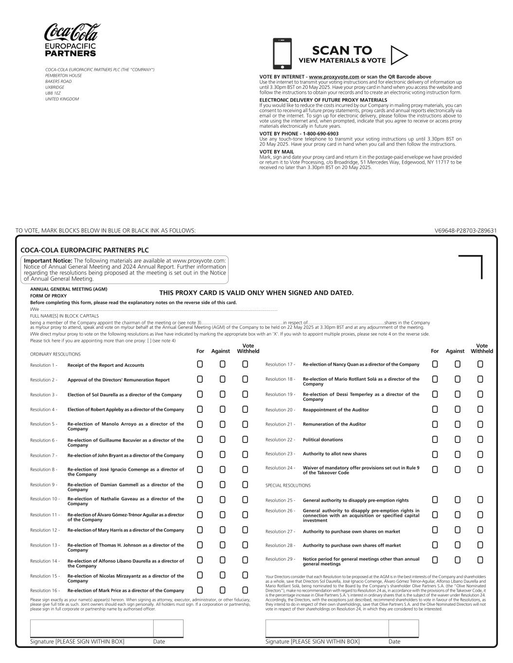 Part III Notes to the Notice of 2025 Annual General Meeting Appointment of proxies 1. Shareholders are entitled to appoint a proxy to exercise all or any of their rights to attend and to speak and vote on their behalf at the meeting. A Shareholder may appoint more than one proxy in relation to the AGM provided that each proxy is appointed to exercise the rights attached to a different share or shares held by that Shareholder. If a member appoints more than one proxy and the proxy forms appointing those proxies would give those proxies the apparent right to exercise votes on behalf of the member over more shares than are held by the member, then each of those proxy forms will be invalid and none of the proxies so appointed will be entitled to attend, speak or vote at the AGM. A proxy need not be a Shareholder of CCEP. 2. A proxy form which may be used to make such appointment and give proxy instructions accompanies this Notice. If you do not have a proxy form and believe that you should have one, or if you require additional forms, please contact the Company Secretary at Pemberton House, Bakers Road, Uxbridge UB8 1EZ, United Kingdom, or by email at shareholders@ccep.com. 3. Any power of attorney or any other authority under which the proxy form is signed (or a duly certified copy of such power or authority) must be included with the proxy form. 4. To be valid, any proxy form or other instrument appointing a proxy must be received no later than 3:30pm BST on 20 May 2025 (or, in the event of any adjournment, 48 hours before the time of the adjourned Meeting). A member may vote by choosing one of the following methods: (a) Voting via the internet: to vote via the internet, go to www.proxyvote.com. Have the information printed on the proxy form in the box marked by the arrow →[xxxx xxxx xxxx xxxx] available and follow the instructions. (b) Voting by mail: to vote by mail, request a paper copy of the proxy materials, which will include a proxy form and postage-paid envelope for returning your proxy card. (c) Voting in person: to vote at the Meeting, you will need to request a poll card and complete it at the Meeting. 5. In the case of a Shareholder which is a company, the proxy form must be executed under its common seal or signed on its behalf by an officer, attorney or other person authorised to sign it for CCEP. 6. The proceedings of a general meeting shall not be invalidated where an appointment of a proxy in respect of that meeting is sent in electronic form as provided above, but because of a technical problem it cannot be read by the recipient. 7. In the case of joint holders, where more than one of the joint holders purports to appoint a proxy, only the appointment submitted by the most senior holder will be accepted. Seniority is determined by the order in which the names of the joint holders appear in CCEP's register of members in respect of the joint holding (the first-named being the most senior). 8. If you submit more than one valid proxy appointment in respect of the same share, the appointment received last before the latest time for the receipt of proxies will take precedence. If CCEP is unable to determine which notice was last received, none of them shall be treated as valid in respect of that share. 9. A vote withheld is not a vote in law, which means that the vote will not be counted in the calculation of votes for or against the resolution. If no voting indication is given, your proxy will vote or abstain from voting at his or her discretion. Your proxy will vote (or abstain from voting) as he or she thinks fit in relation to any other matter which is put before the AGM. 10. The return of a completed proxy form, other such instrument or any CREST Form of Instruction or similar proxy instruction (as described in paragraphs 11 to 14 below) will not prevent a Shareholder attending the AGM and voting in person if he/she wishes to do so. 27