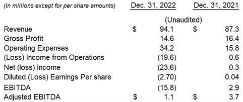 | · | As of December 31, 2022, cash and cash equivalents equaled $7.5 million |
