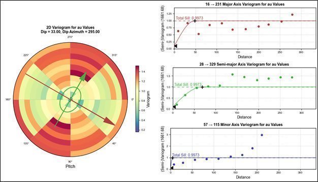 Figure 28‑7 Klondike Zone Popcorn Vein Experimental Variogram with Modeled Variogram