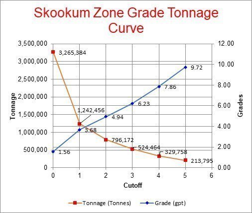 Figure 29‑1 Grade Tonne Curve for the Skookum Zone Resource and Reserve Combined
