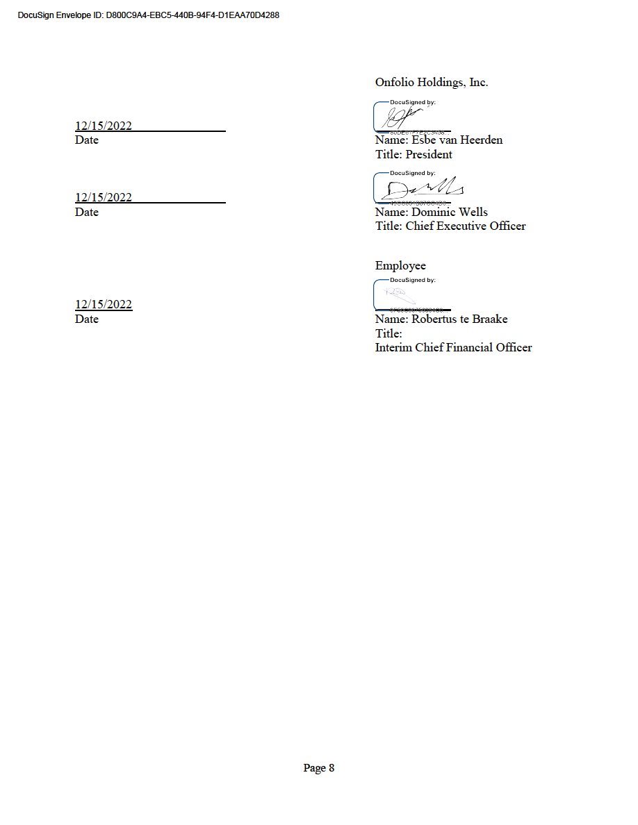 By signing below, the undersigned acknowledges and confirms that the undersigned has received and reviewed a copy of the Onfolio Holdings Inc. Nasdaq Rule 5608 Executive Officer Compensation Clawback Policy (the “Policy”).