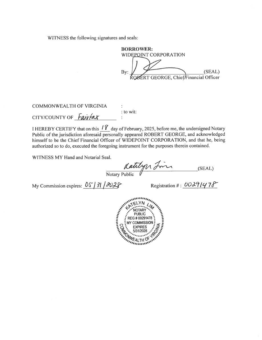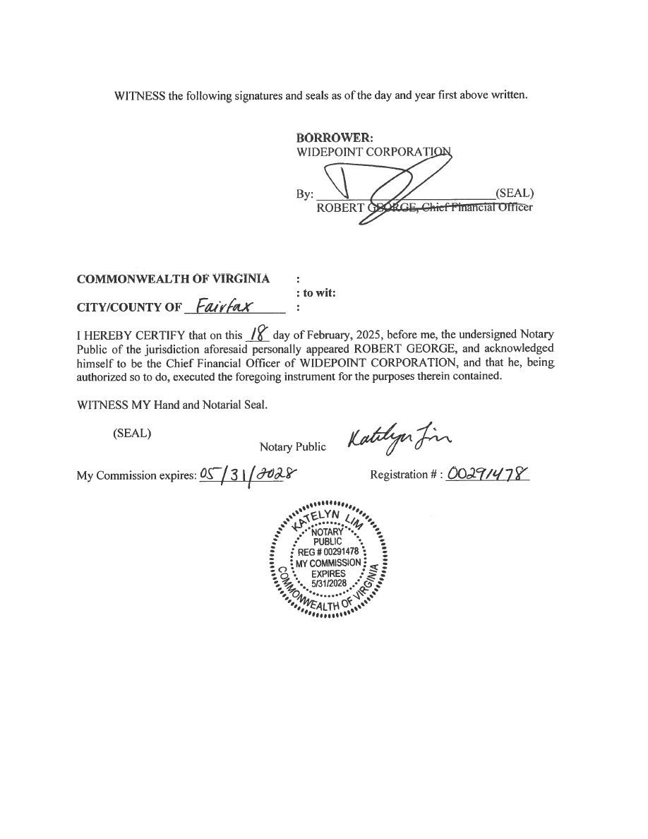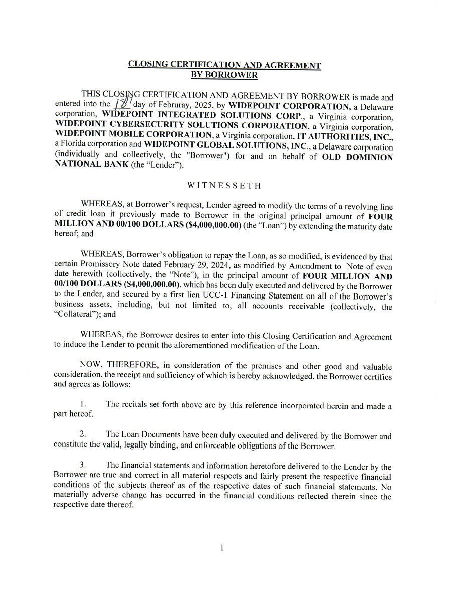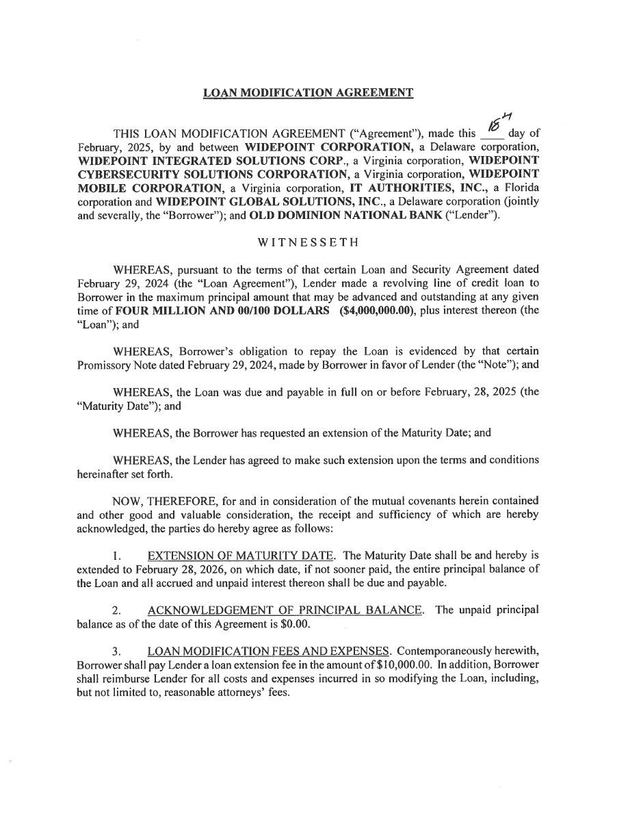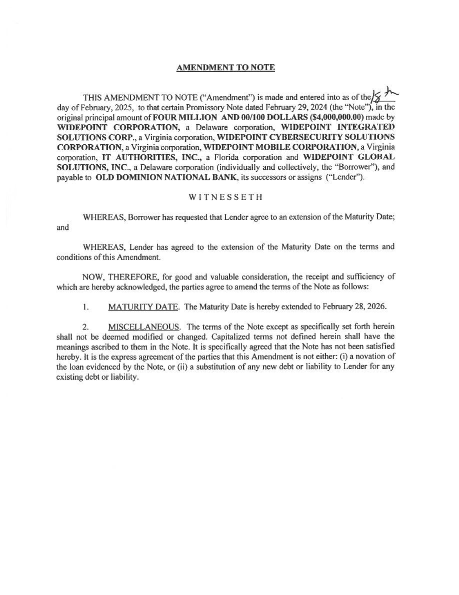 On February 18, 2025, WidePoint Corporation and its subsidiaries (the “Company”), as borrower, entered into a new Loan and Security Agreement (the “Loan”) and Promissory Note (the “Note,” and, together with the Loan, the “Agreements”) with Old Dominion National Bank. The Agreements provide for a $4,000,000 revolving line of credit facility (the “Credit Facility”). The new Loan Agreements replaced the Loan and Agreement entered into on February 29, 2024. The terms of the new Agreement are unchanged from the previous Agreement.
