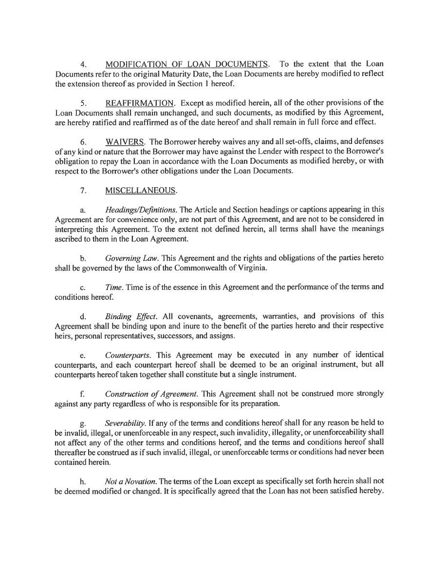 The description of the Agreements set forth above are qualified by reference to the Amendment to the Note filed herewith as Exhibit 10.1, the Loan Modification Agreement filed herewith as Exhibit 10.2, and the Closing Certification filed herewith as Exhibit 10.3, which exhibits are incorporated herein by reference.
