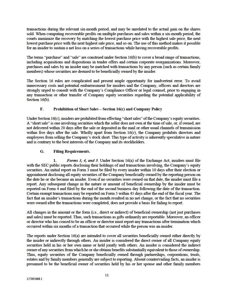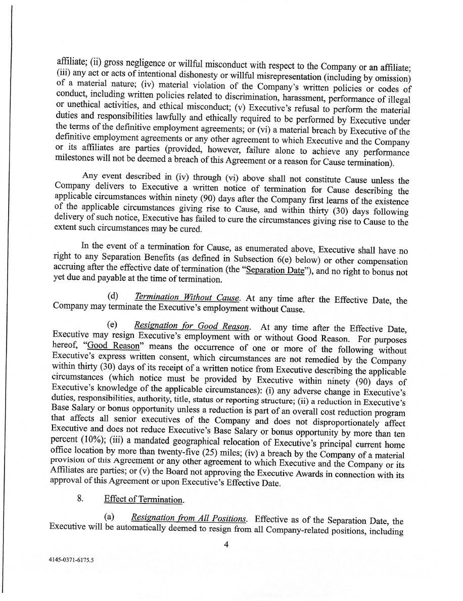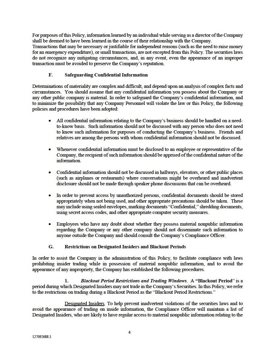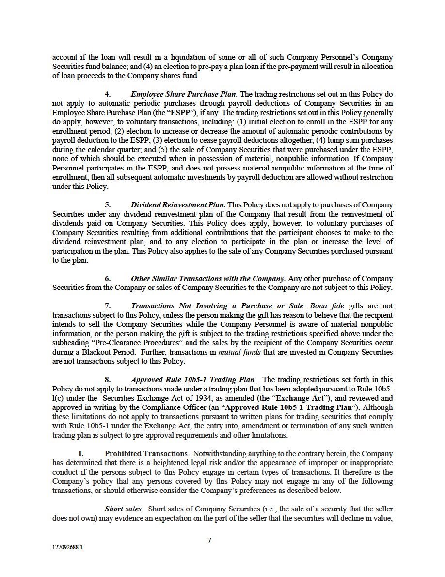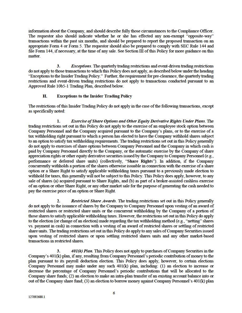 In connection with any underwritten public offering by the Company of its equity securities, and if requested by the underwriters of such public offering, the Participant shall be obligated not, directly or indirectly, to sell, make any short sale of, loan, hypothecate, pledge, offer, grant or sell any shares or other contract for the purchase of, purchase any shares or other contract for the sale of, or otherwise dispose of or transfer, or agree to engage in any of the foregoing transactions with respect to, any RSU or shares of Common Stock without the prior written consent of the Company or its underwriters. Such restriction (a “Market Stand-Off”) will be in effect for such period of time following the date of the final prospectus for the offering as may be required by the underwriters. In the event of the declaration of a stock dividend, a spin-off, a stock split, an adjustment in conversion ratio, a recapitalization or a similar transaction affecting the Company’s outstanding securities without receipt of consideration, any new, substituted or additional securities which are by reason of such transaction distributed with respect to any shares of Common Stock subject to the Market Stand-Off, or into which such shares thereby become convertible, shall immediately be subject to the Market Stand-Off. In order to enforce the Market Stand-Off, the Company will be entitled to require the Participant to execute a form of undertaking to this effect or impose stop-transfer instructions with respect to the shares of Common Stock acquired upon the vesting of the RSU until the end of the applicable stand-off period. The Company’s underwriters shall be beneficiaries of the agreement set forth in this Section 4.