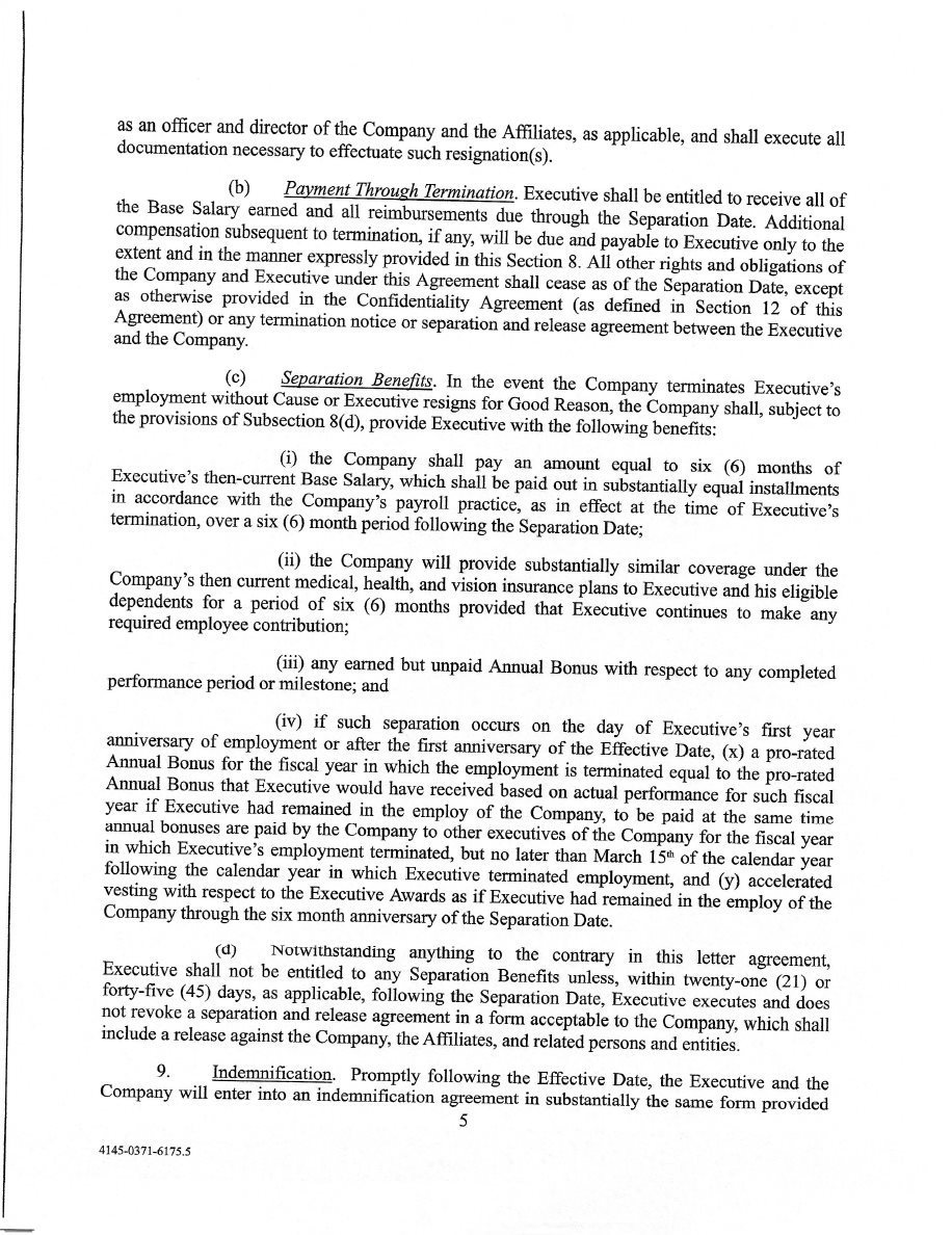 8.4. Successors and Assigns. This Agreement shall be binding upon and shall inure to the benefit of the Company, its successors and assigns, and the Company shall require such successor or assign to expressly assume and agree to perform this Agreement in the same manner and to the same extent that the Company would be required to perform it if no such succession or assignment had taken place. The term “successors and assigns” as used herein shall include a corporation or other entity acquiring all or substantially all the assets and business of the Company (including this Agreement) whether by operation of law or otherwise.