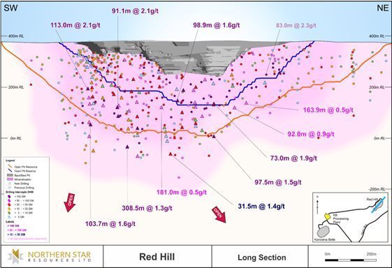The Red Hill gold deposit is located 3.5km east of Northern Star’s Kanowna Belle mine and processing plant and 22km north-east of Northern Star’s Kalgoorlie Consolidated Gold Mines Operations (“KCGM”), which includes the Fimiston processing plant in Western Australia. KCGM and the Fimiston plant are currently undergoing a major brownfield expansion project(2) by Northern Star. The A$1.5 billion KCGM Mill Expansion Project is scheduled for commissioning in FY27 and expected to increase processing capacity from 13Mtpa to 27Mtpa. The Red Hill project was historically mined as an open pit operation between 2001 and 2007, producing approximately 467,000oz.